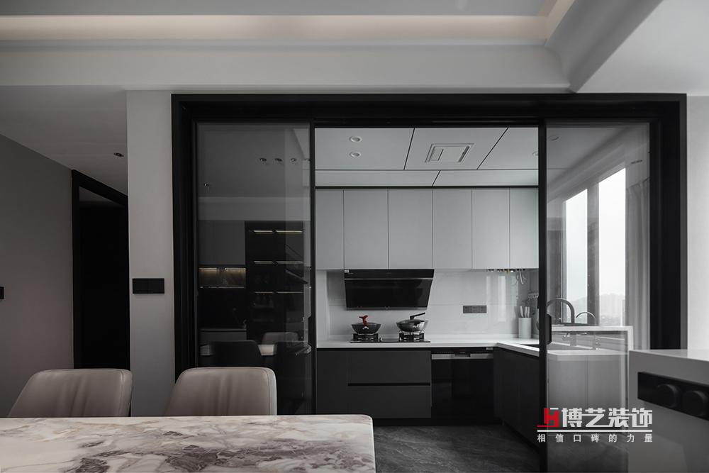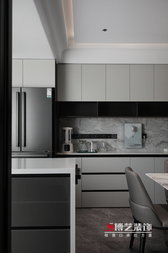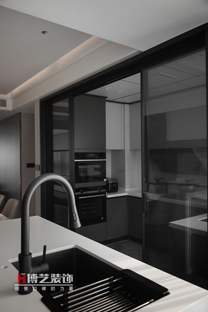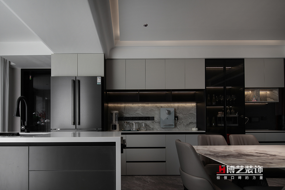 廚房曾被稱之為家里最孤獨(dú)的地方,但是隨著互動(dòng)式家居設(shè)計(jì)的流行,這種孤獨(dú)感也逐漸在被打破。六口之家,家里開火的時(shí)間很多,用四聯(lián)動(dòng)的玻璃移門進(jìn)行隔斷。熱愛生活的人都熱愛烹飪,而熱愛烹飪的人總是懂生活的人。島臺(tái)冰箱外置,形成了很大的拿取洗切煮的大動(dòng)線,再多人參與都不再話下。陽光和煦,微風(fēng)浮動(dòng),菜香四溢,家人圍坐,我想這就是幸福的味道吧。