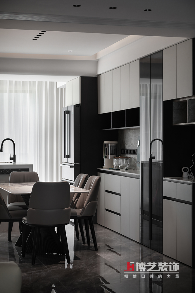 3. 打通北陽臺(tái),餐廳以整排餐邊柜,島臺(tái),餐桌的形式來呈現(xiàn)。