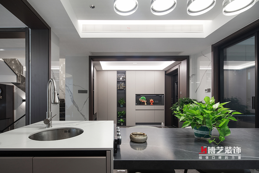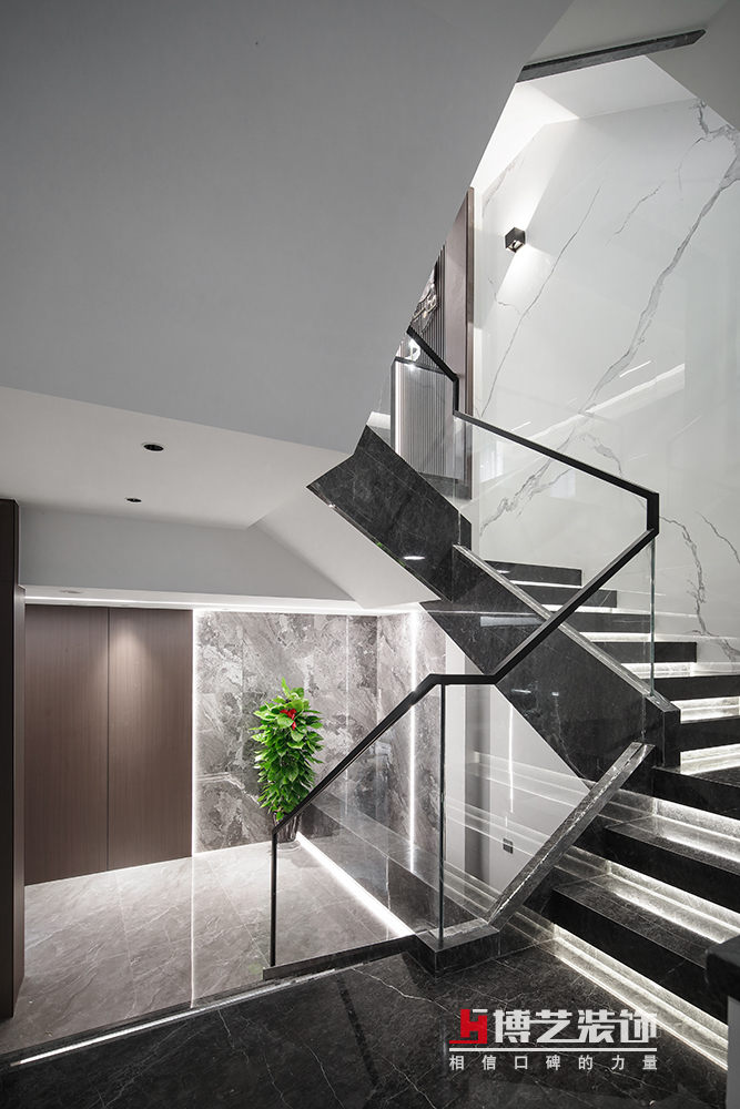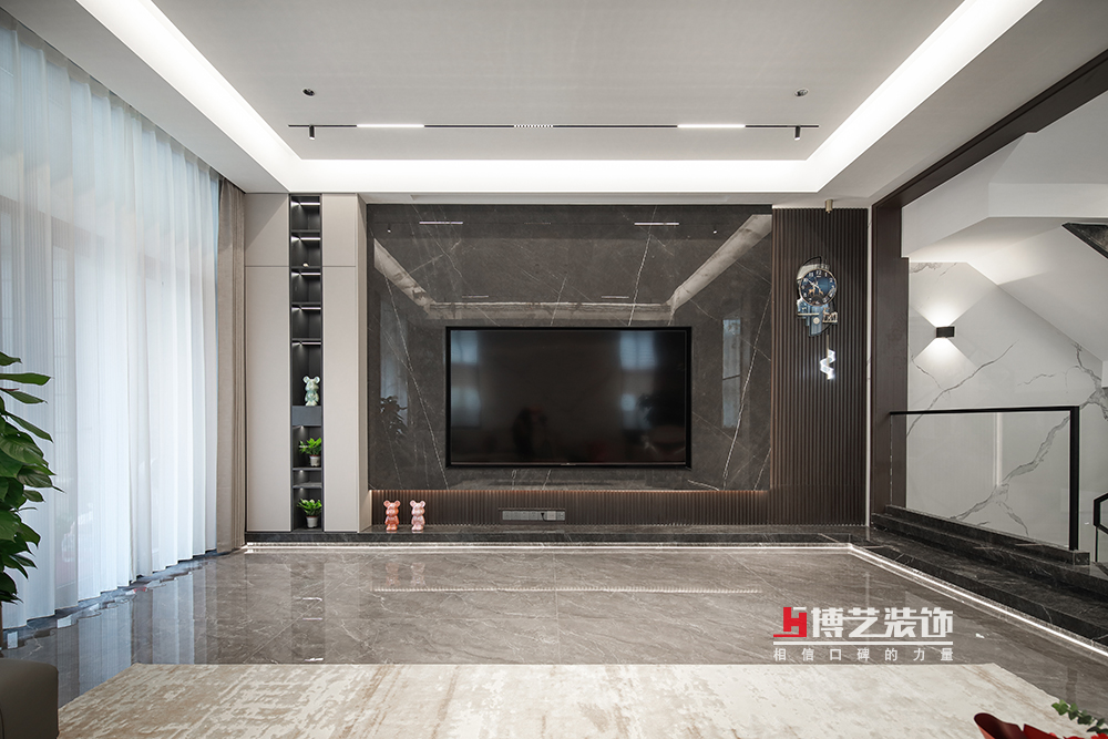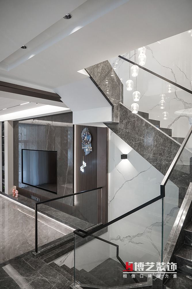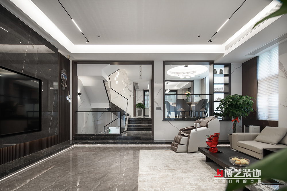 設(shè)計(jì)師以經(jīng)典的黑白灰色調(diào)入手,調(diào)和著現(xiàn)代住宅對(duì)于低調(diào)質(zhì)感生活的追求。通過合理運(yùn)用玻璃,石材,格柵,不銹鋼,布藝,皮質(zhì)等不同材質(zhì),融合進(jìn)整個(gè)一樓公區(qū)。無主燈的設(shè)計(jì)搭配下沉式空間,讓整個(gè)客廳區(qū)域彰顯氣質(zhì)。電視機(jī)的黑色大理石背景和沙發(fā)的白色大理石背景遙相呼應(yīng),在黑白之間,打造無限延伸的空間感。