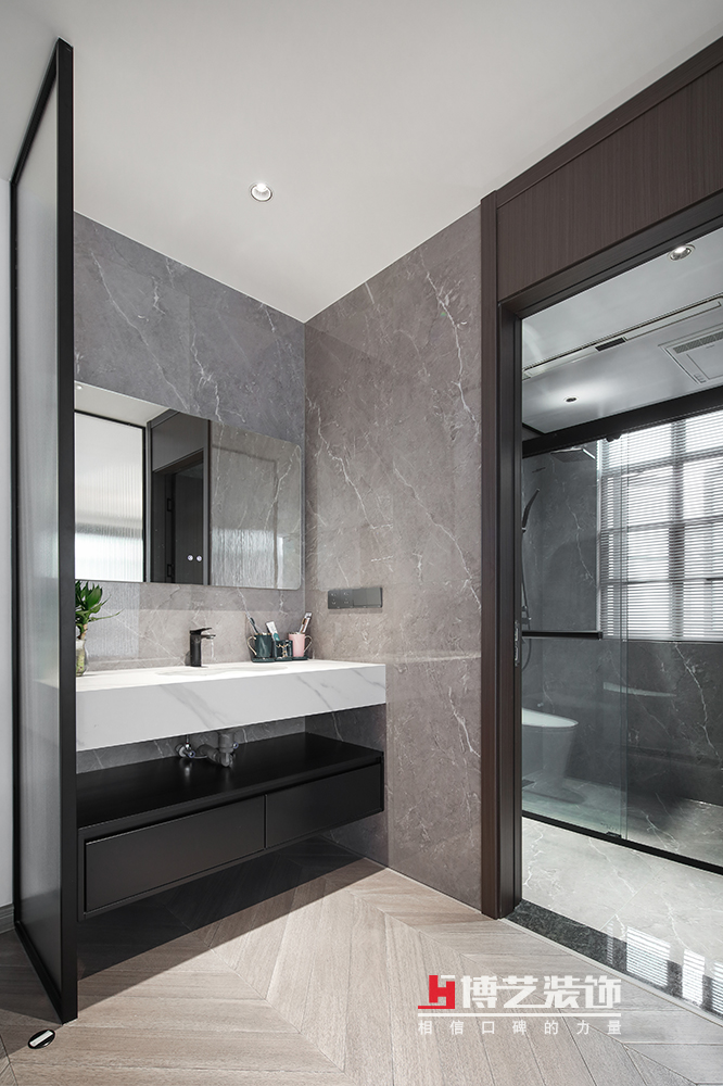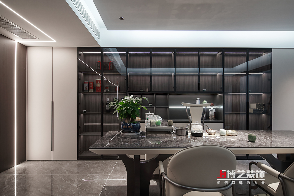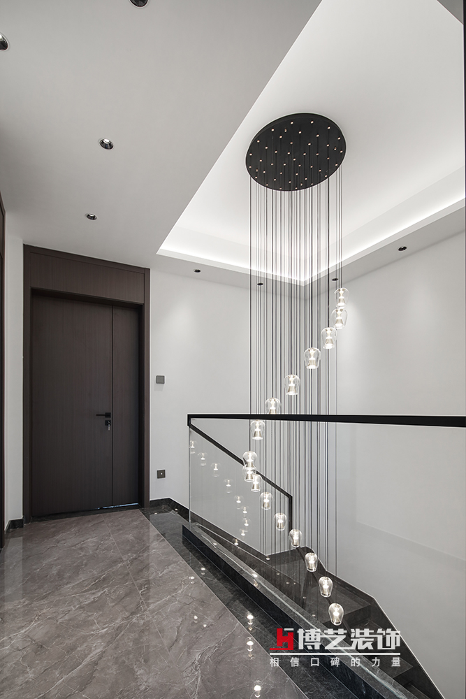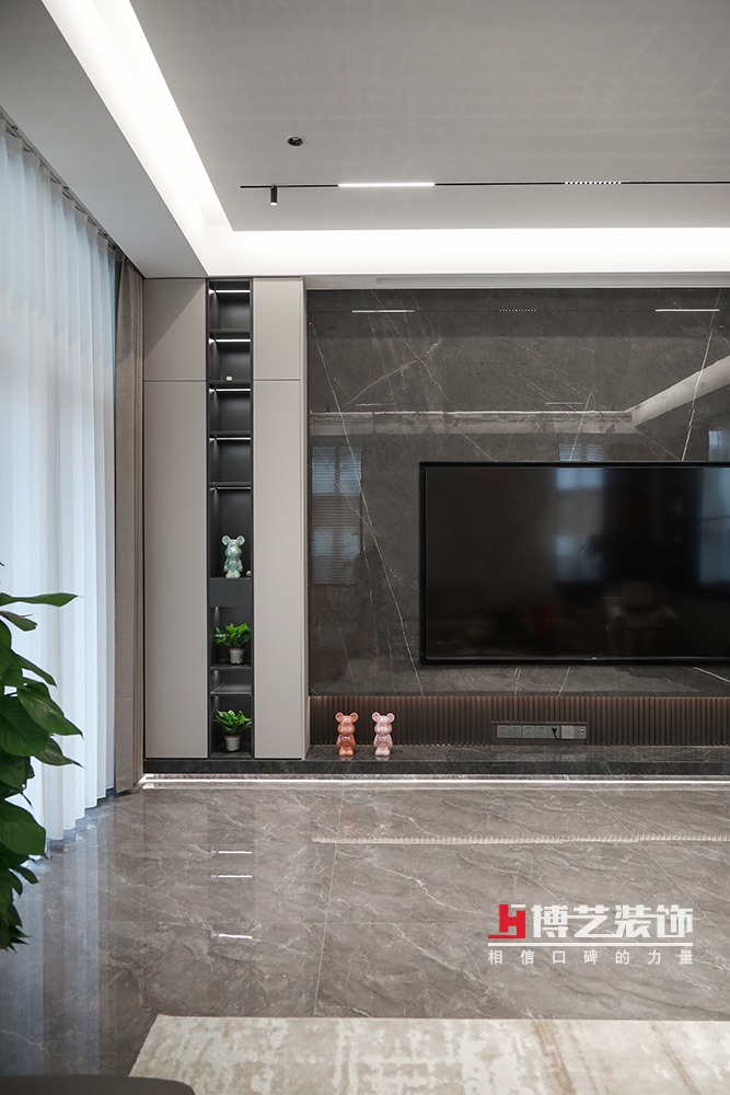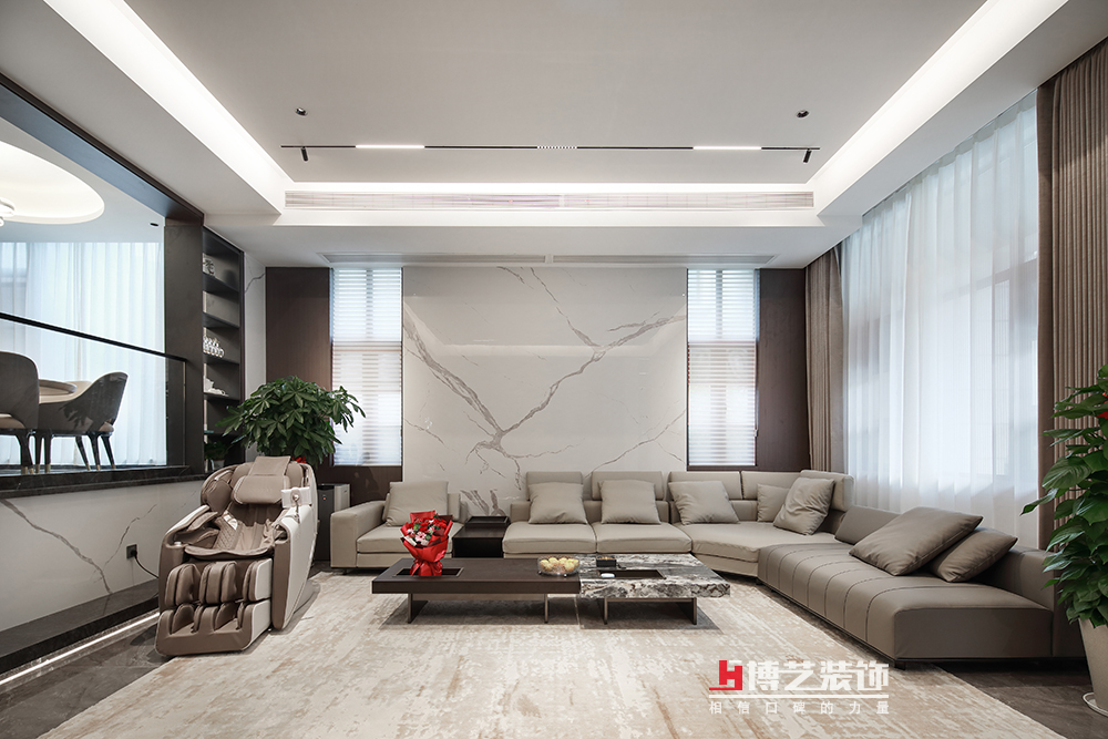 設(shè)計(jì)師以經(jīng)典的黑白灰色調(diào)入手,調(diào)和著現(xiàn)代住宅對(duì)于低調(diào)質(zhì)感生活的追求。通過合理運(yùn)用玻璃,石材,格柵,不銹鋼,布藝,皮質(zhì)等不同材質(zhì),融合進(jìn)整個(gè)一樓公區(qū)。無主燈的設(shè)計(jì)搭配下沉式空間,讓整個(gè)客廳區(qū)域彰顯氣質(zhì)。電視機(jī)的黑色大理石背景和沙發(fā)的白色大理石背景遙相呼應(yīng),在黑白之間,打造無限延伸的空間感。