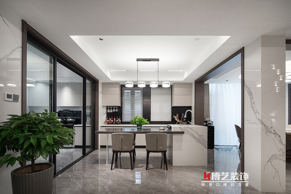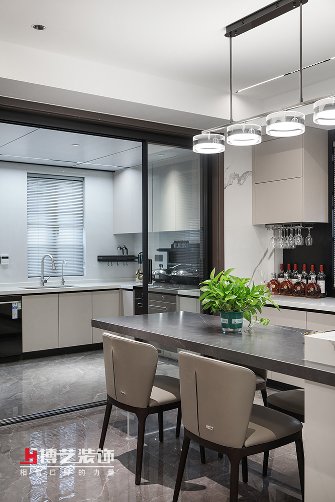 開放式的島臺(tái)作為廚房和餐廳之間的過度,也保留了西廚的使用功能。