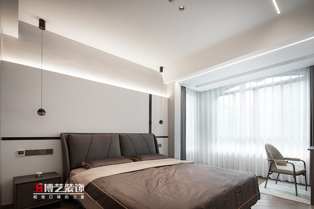 主臥用了一整個(gè)大套房的設(shè)計(jì),休息區(qū),收納區(qū),洗漱區(qū),晾曬區(qū),小憩區(qū),安排得井井有條。整個(gè)色系布置都靜謐寧靜,用白色為主基調(diào),摻進(jìn)細(xì)膩的奶咖色,平添了層次感,讓空間一下柔了起來。