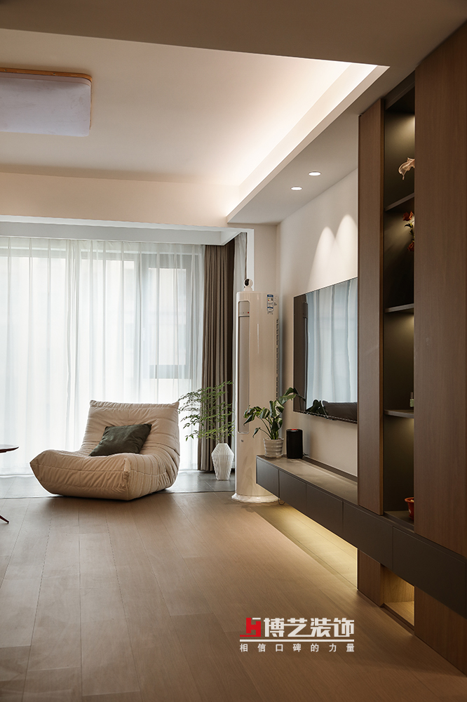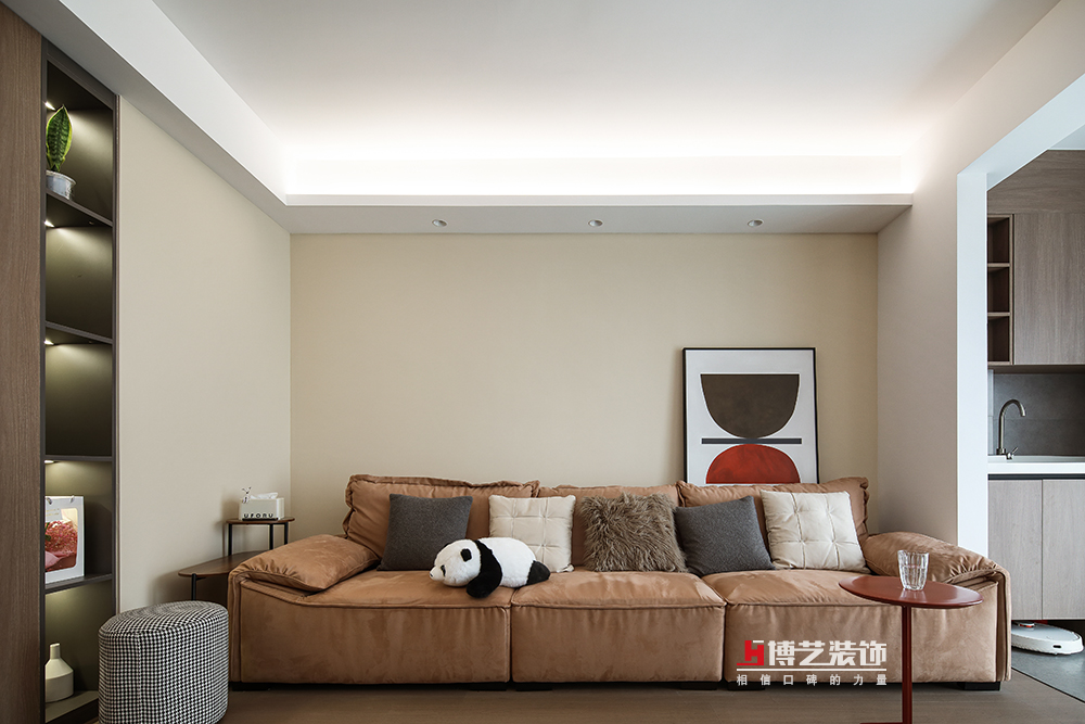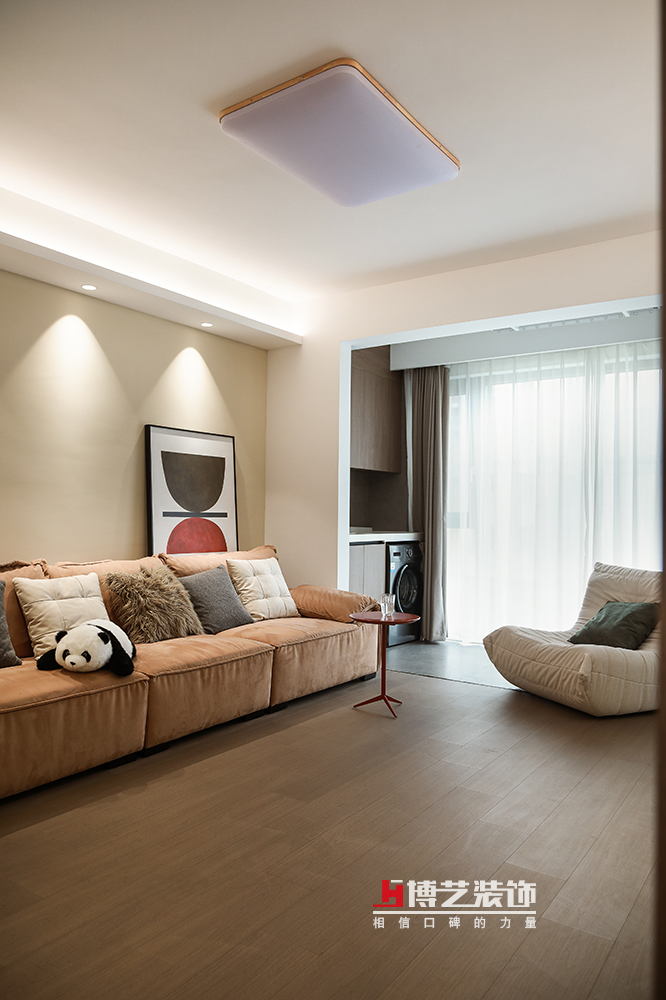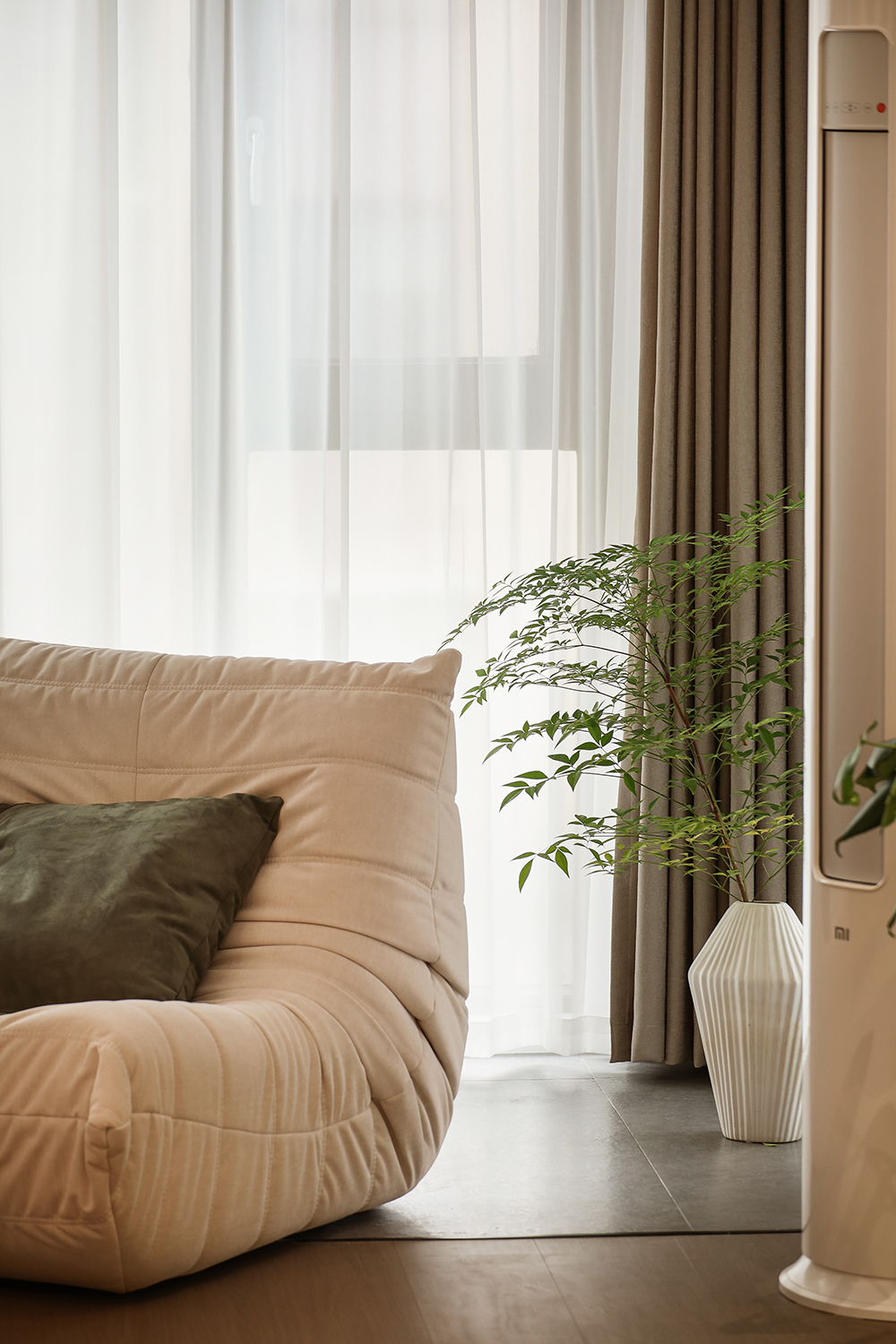打通了南陽(yáng)臺(tái),把餐廳往內(nèi)移,客廳一下從視野上打開(kāi)。選用了大面積的米色墻面,營(yíng)造寧?kù)o而柔和的氛圍。全屋通鋪地板,以及同色系柜子,搭配去茶幾化的設(shè)計(jì)讓客廳更具松弛感。