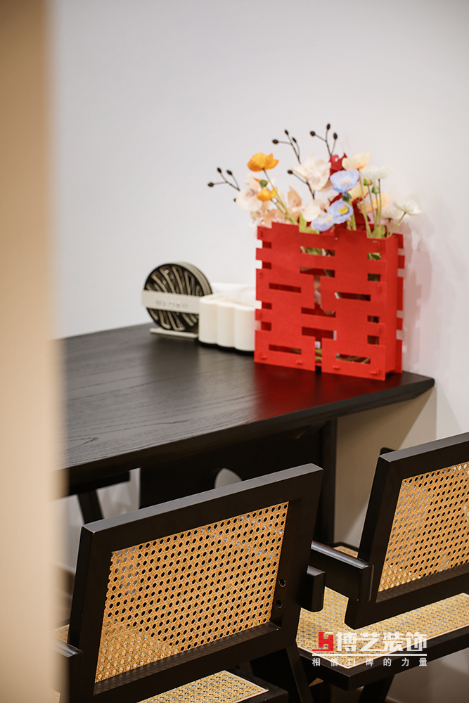 把西廚和冰箱位置安置在了餐廳,上面整齊的陳列展示著主人一家的生活品味和知性情趣。隨處可見(jiàn)的喜字也宣告著主人甜蜜幸福的婚姻生活的開(kāi)啟。