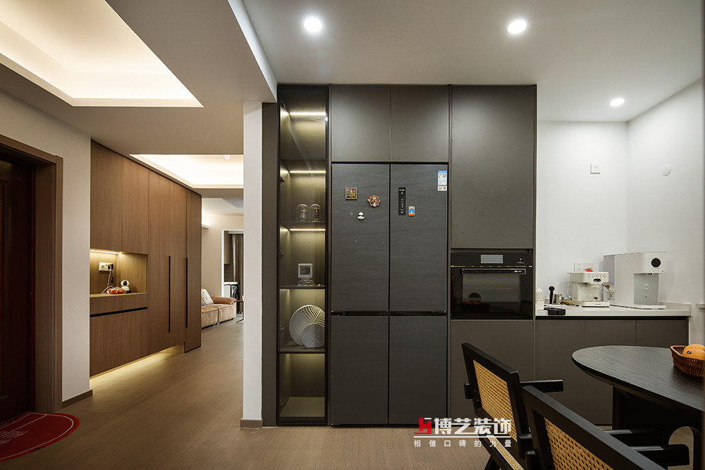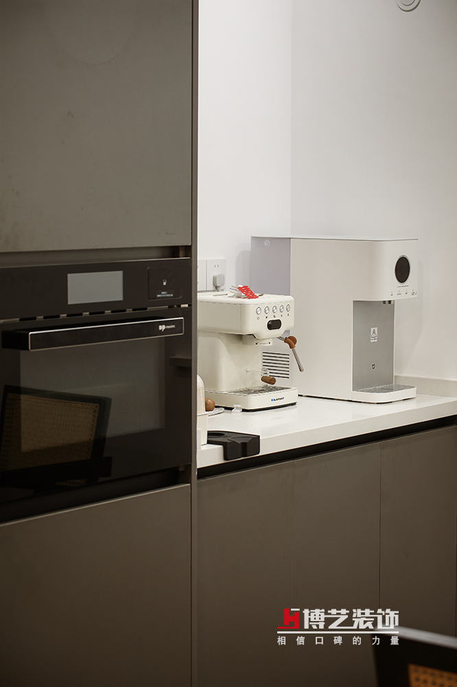 把冰箱挪出廚房后,廚房面積也一下開(kāi)闊了,木色的櫥柜面和白色的臺(tái)面在灰色的墻面背景下相映成趣,營(yíng)造了干凈整潔的烹飪環(huán)境。