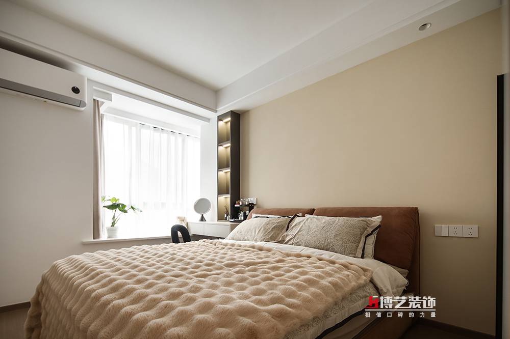 主臥色系延續(xù)了客廳的奶茶色系,靜謐柔和。主臥利用了飄窗位,一個(gè)專(zhuān)屬女主人的化妝間就應(yīng)運(yùn)而生,在黑與白的空間里,是女主人對(duì)美的極致追求。