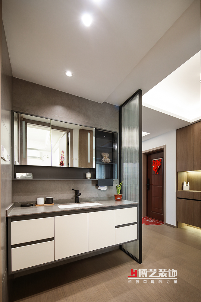 木質(zhì)地板的自然紋理和光澤,給整個(gè)家居帶來(lái)了沉穩(wěn)的基調(diào),公區(qū)與衛(wèi)生間之間用了長(zhǎng)虹玻璃門(mén),透光的同時(shí),兼顧了美觀。