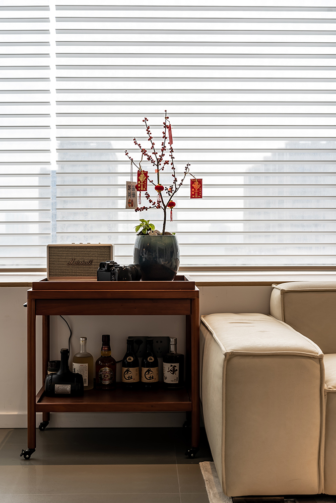 用一個小小的邊幾作為客廳和餐廳之間的過度,放上好酒好茶,共品音樂詩畫。落地飄窗搭配百葉簾,讓整個客廳蒙上了陽光的濾鏡。