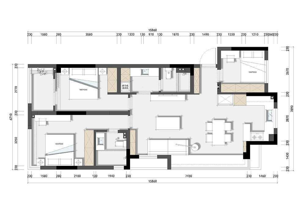 本案的戶型屬于狹長型,在布局上設計師基本保持戶型原有的格局,在區(qū)域內將空間盡可能打開,提高生活舒適度。公共區(qū)域的客、餐、廚做聯(lián)動設計,功能不變空間擴大,同時三區(qū)聯(lián)動增加家庭成員的親密度。色彩上以溫馨的奶油白為主色調,灰色、棕色、綠色分別以不同的形態(tài)點綴,共同組成生活的起點。伴是煙火,伴是生活。