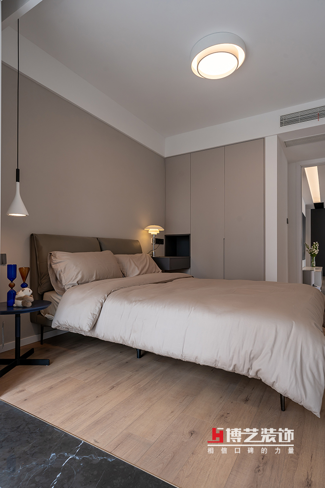 打通了次臥和陽臺,次臥采光就變得很好。同色系的床背景和柜子讓整個空間看著更加整體。用地磚和地板做空間之間的隔離,拉上窗簾就是兩個不同的空間。