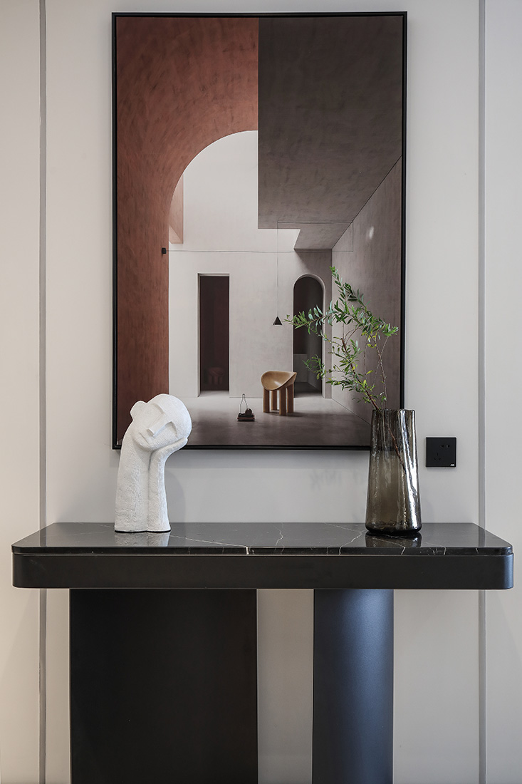 通過光線的暈染,讓黑色不顯沉悶,讓軟裝更加舒適,黑色與米色平衡了環(huán)境中的色彩,增加質(zhì)感。