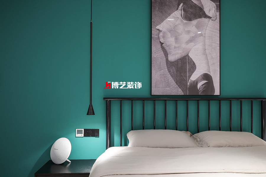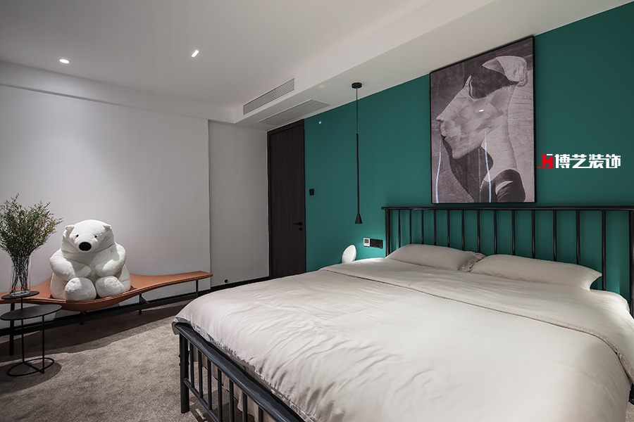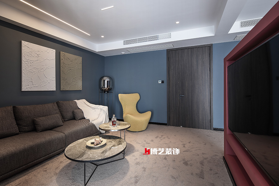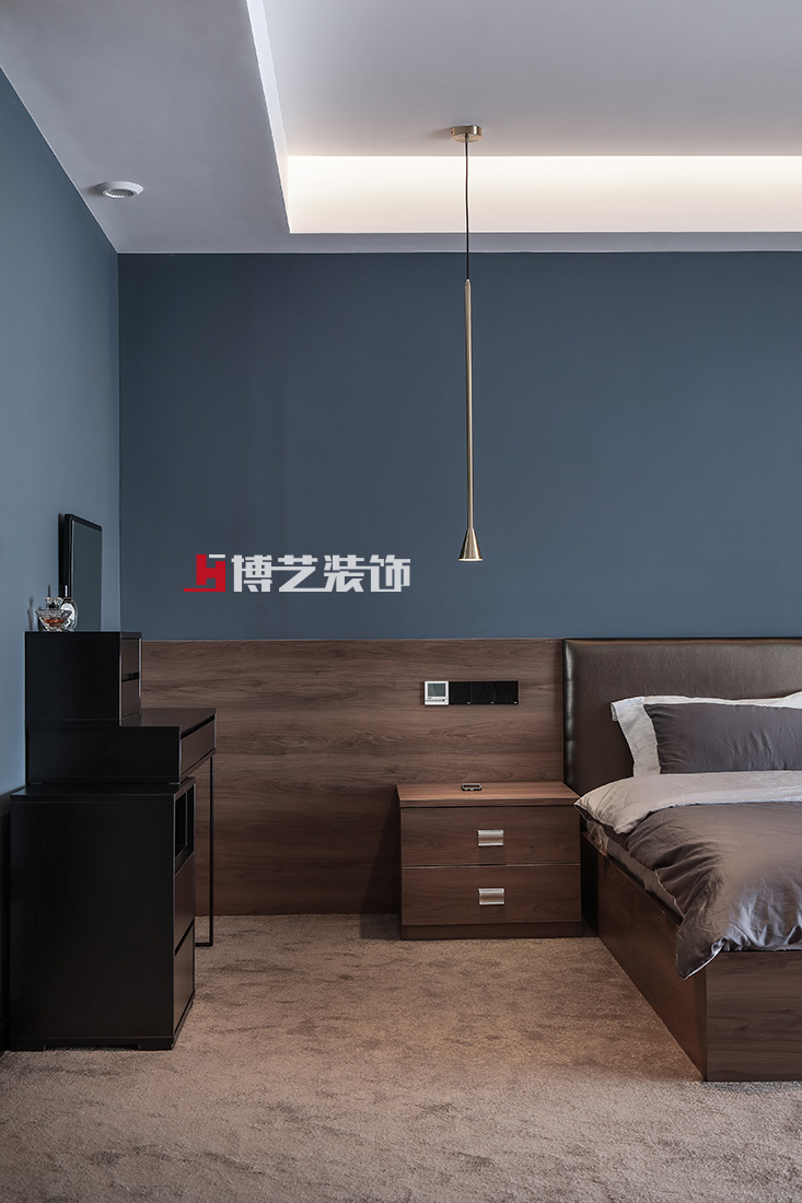 臥室采用藍灰色墻面,搭配棕色木飾面與地毯,軟硬結(jié)合,彰顯主人氣質(zhì)。紅色電視隔斷又調(diào)整了空間的亮度,搭配簡單的軟裝,不繁瑣,不簡單。