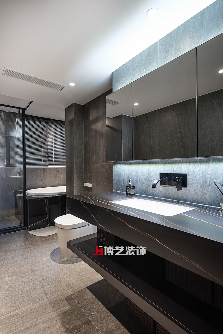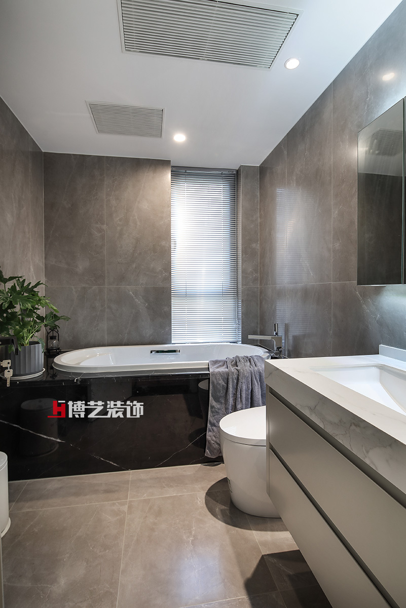 衛(wèi)生間依舊用深色表現(xiàn)溫暖,泡上一個澡解除一天的疲乏,你的慵懶盡情釋放。