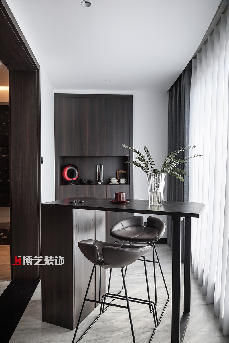 兩扇落地窗保證了餐廳充足的光線,就餐時的心情也會不自覺的明媚起來。黑色大理石餐桌讓空間變得沉穩(wěn),綠植的裝飾又增添了一份生機。