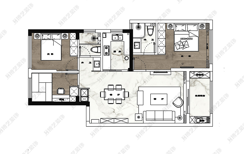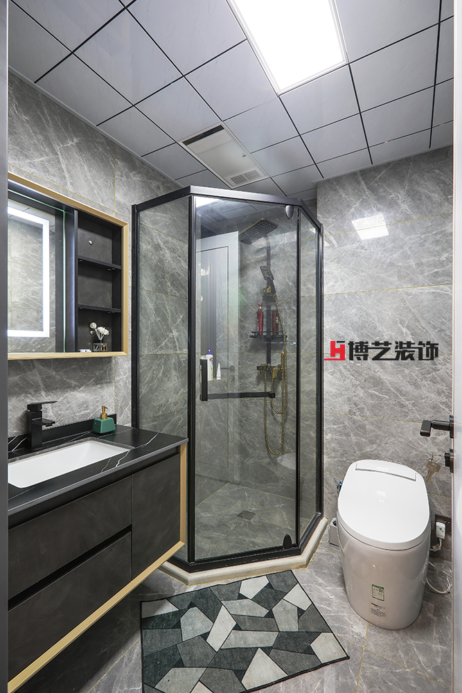 設(shè)計師把套內(nèi)的非承重墻做薄,讓使用面積更多一點;客餐廳做地磚通鋪,讓空間顯大的同時也大氣;外衛(wèi)做干濕分離,充分利用空間;北面書房做榻榻米設(shè)計,既可做客房,也增加儲物功能。