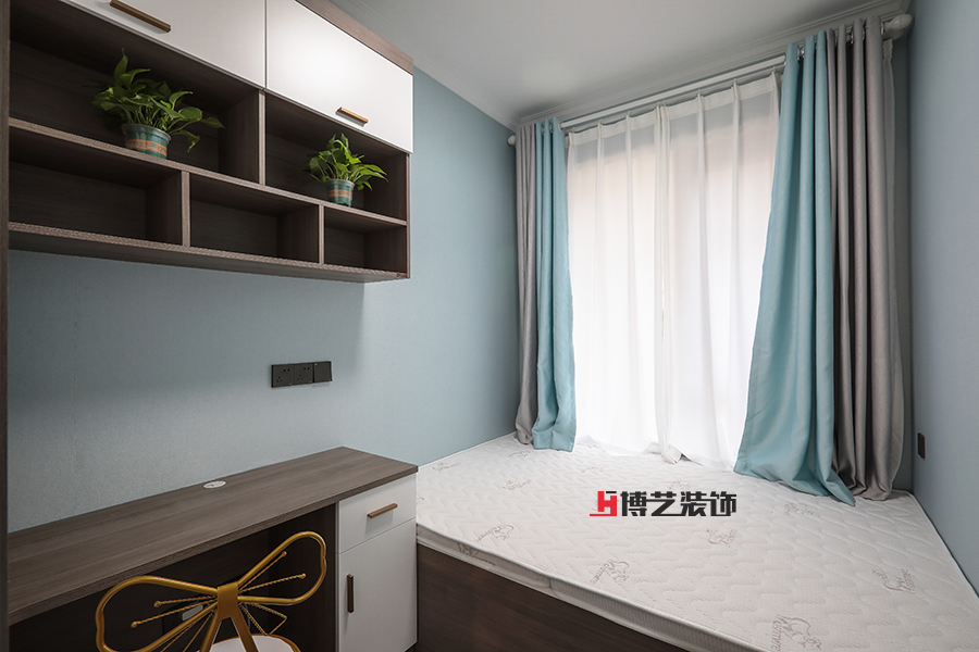 主臥用一整面孔雀藍做背景,其上兩盞金屬壁燈,再搭配一張莫蘭迪藍色皮質(zhì)大床,一股隱隱的精致感撲面而來。