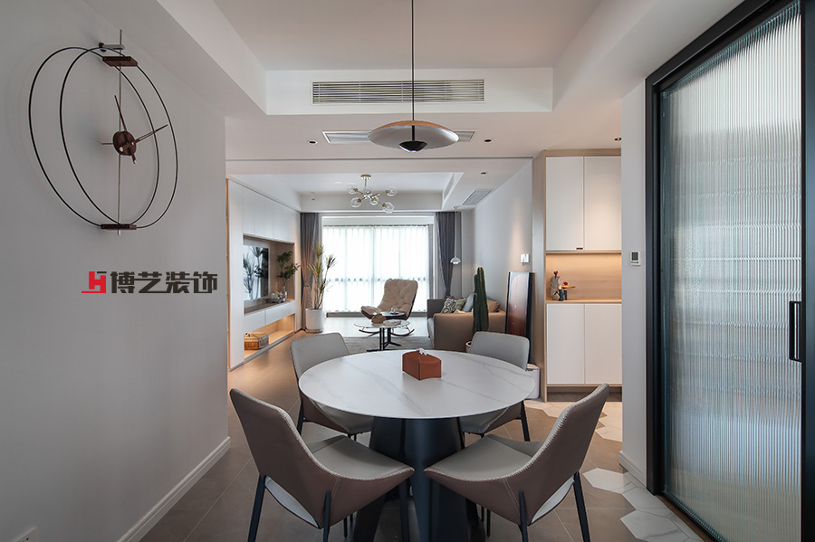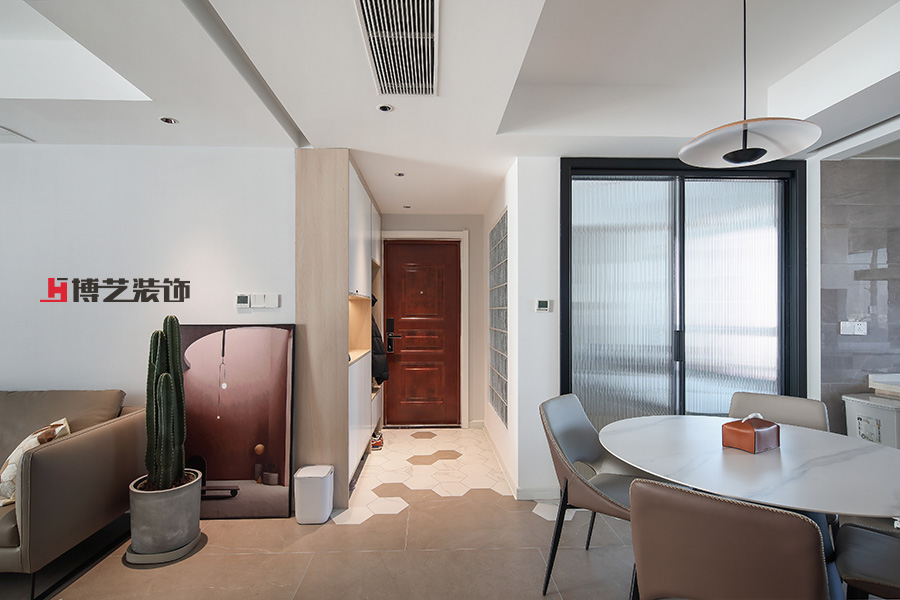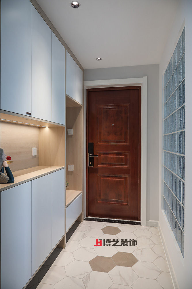 朦朧的玻璃磚讓自然光納入,輔以暖光,讓家的溫暖從進(jìn)門這一刻就鋪面而來。