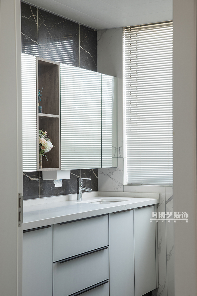 莫蘭迪優(yōu)雅的色彩下,簡(jiǎn)單的線條搭配著材質(zhì)給予的不同質(zhì)感,賦予空間溫度與美感。木作帶來的沉淀與石材散發(fā)的冷冽,交合成一種別樣的氣質(zhì),平靜而美麗。