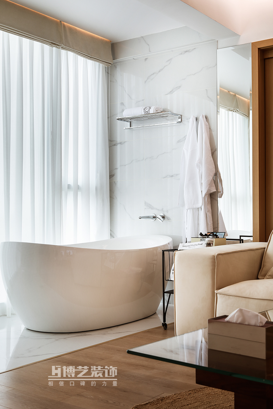 臨床落地的大浴缸,通透感十足,在繁忙了一天的辛勞之后 ,盡情享受舒適的愜意,切換慢節(jié)奏自在度假時光。
