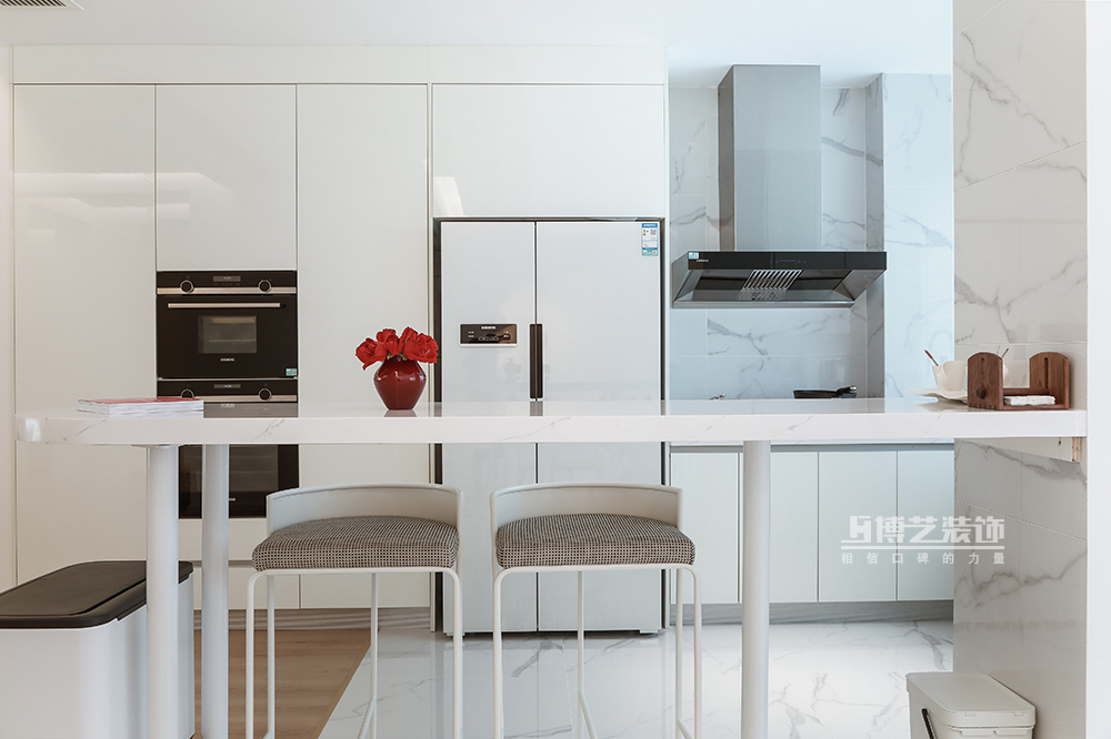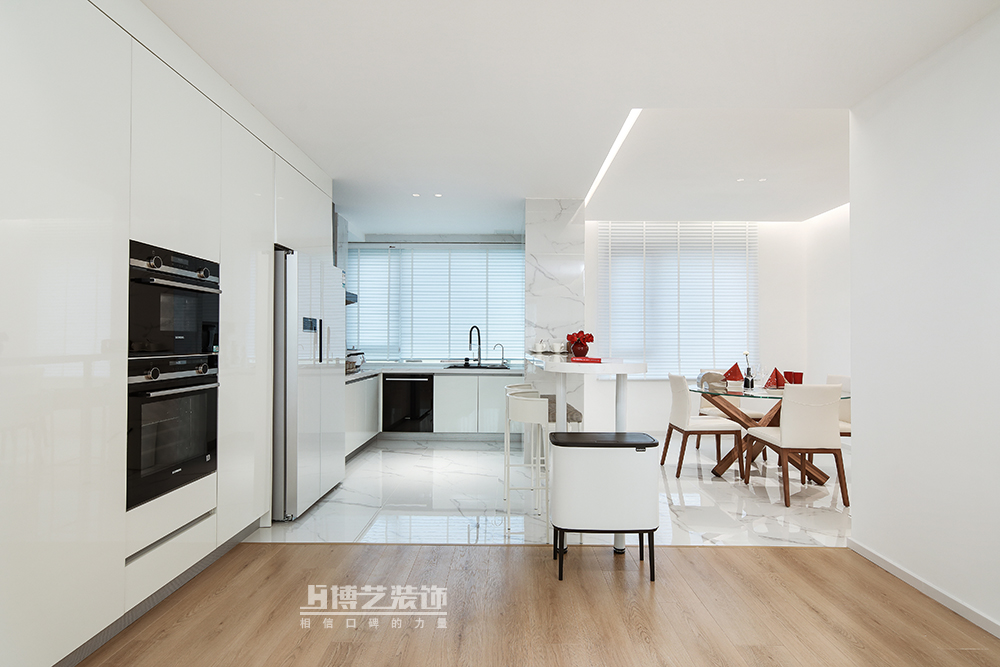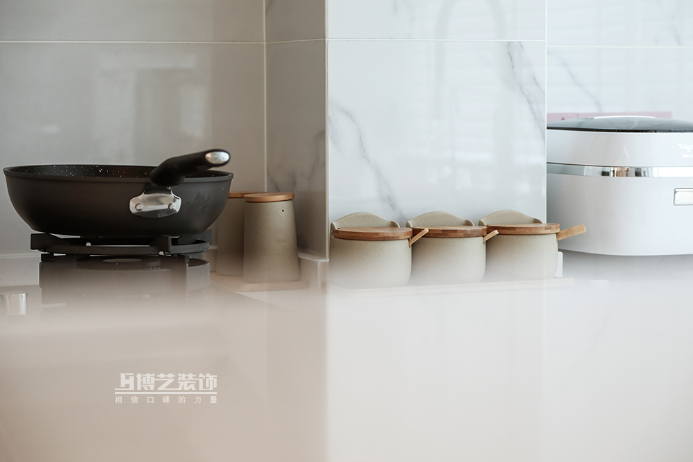全開放的格局,設計師依舊以白色為基底,不摻雜一絲雜色,營造出干凈、簡潔的視覺感官。柴米油鹽的煙火氣與藝術的設計感相迎,還原一片至靜、至遠、至真、至雅的生活意境。