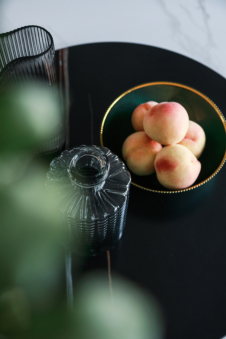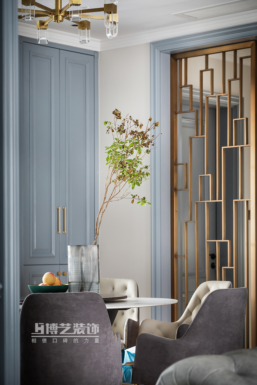 利用空間制作的一組藍灰色餐邊柜,呼應客廳,增加空間的統(tǒng)一性,兼具的收納及展示功能更具實用性。大理石餐桌搭配米色系餐椅,硬朗中帶著柔情,于無聲處彰顯優(yōu)雅,搭配桌邊精致的隔斷,金屬的質(zhì)感提升整體格調(diào)。