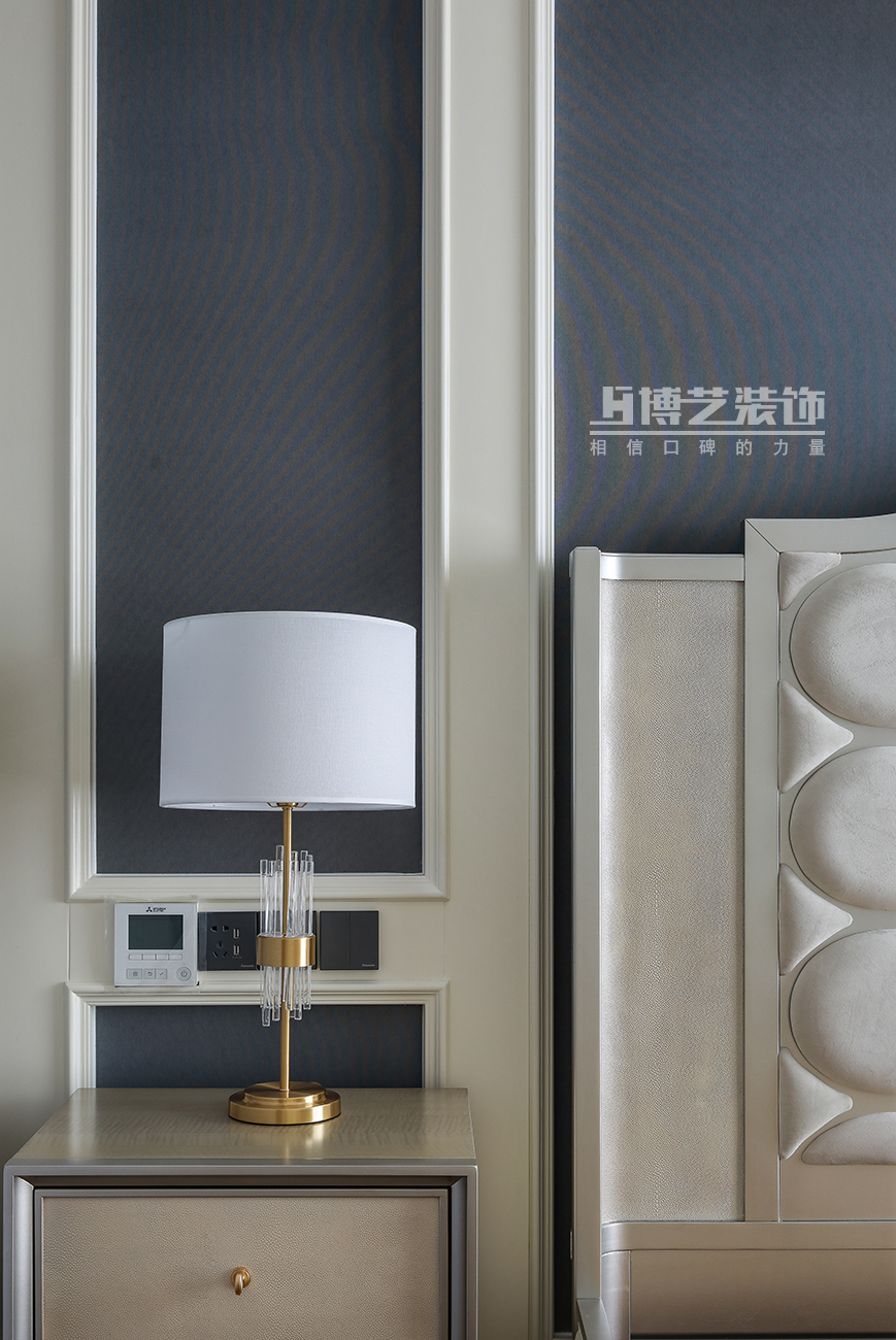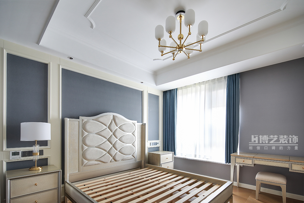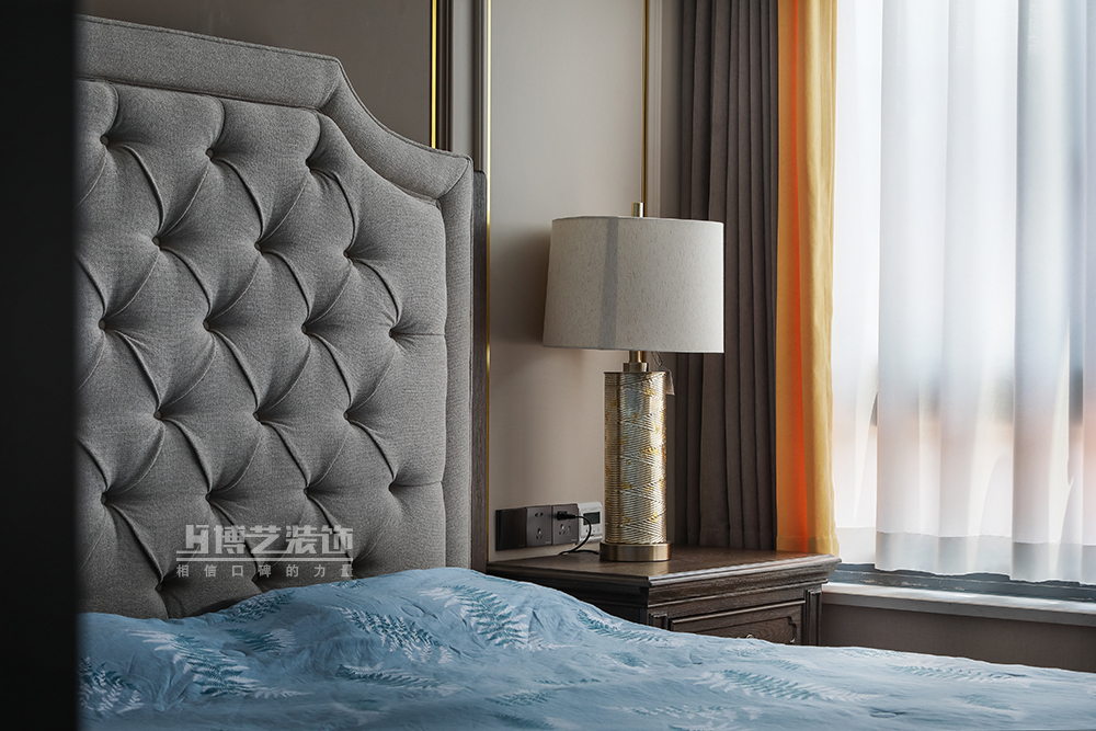 拼色的背景墻往外舒展,延伸視覺,澄凈的藍色與白色搭配,塑造美好素靜的居室氛圍,木質(zhì)的床頭增添了幾分質(zhì)樸的氣息,安靜的感覺不斷擴散。