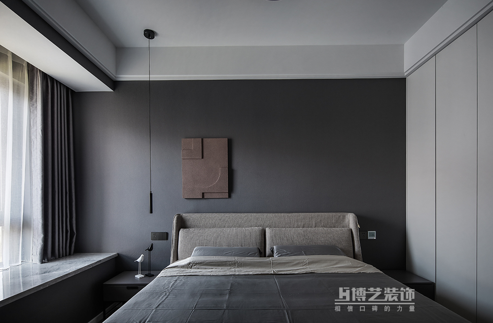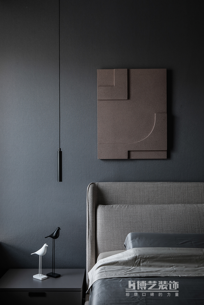 八十度的灰色,靜謐深邃卻也慵懶自得,淺灰色雙人床是對(duì)比與碰撞,極簡(jiǎn)的裝飾畫帶來(lái)視覺(jué)的焦點(diǎn),于靜默安然中成就色彩的完美平衡,一室的含蓄、柔情寂靜綻放。