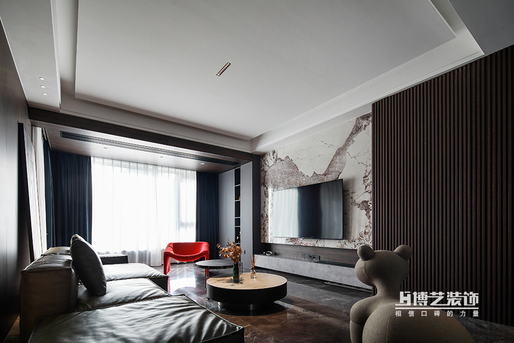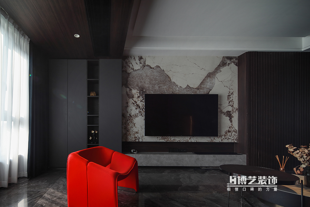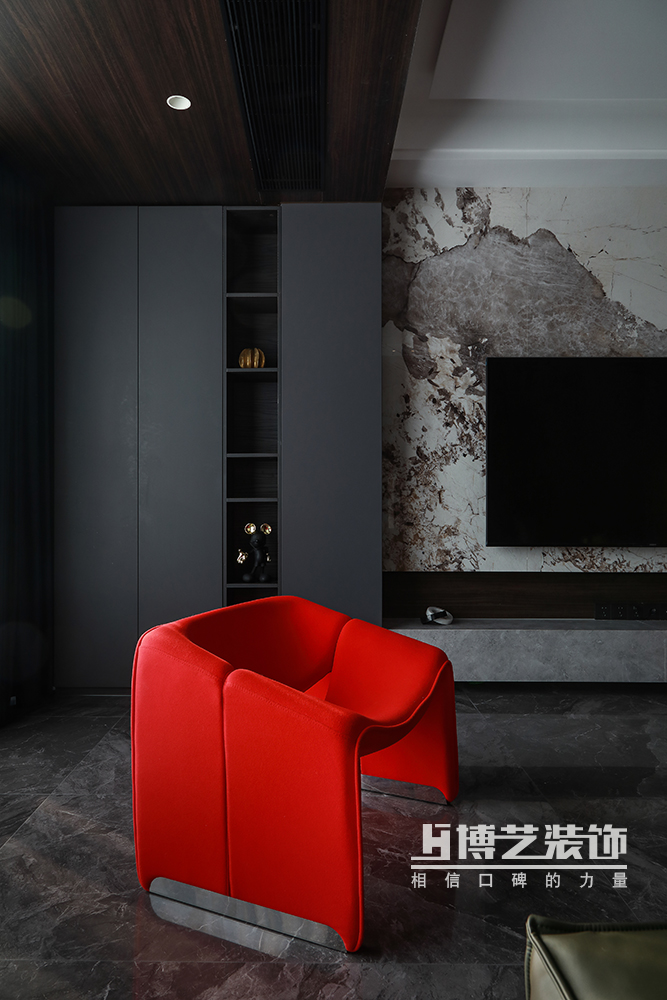 木飾面環(huán)繞的客廳空間溢出滿室的溫情,大理石的應(yīng)用很好的中和了多余的膩味,一把搶眼的紅色單椅,仿佛是空間中注入的光讓生活有了新的定義。