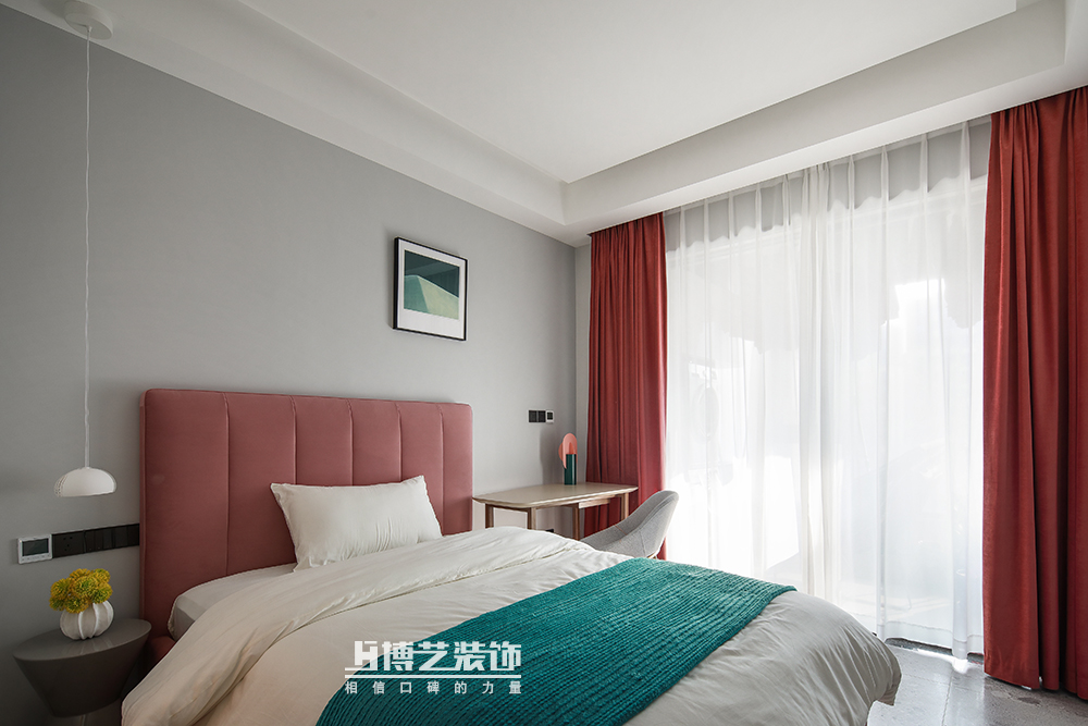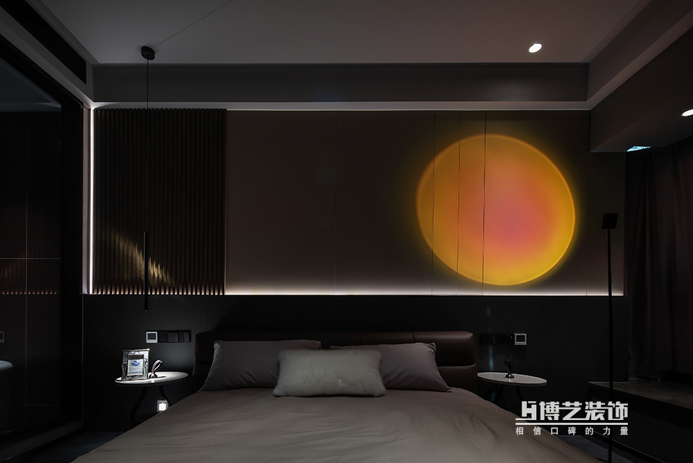 暗色調(diào)的臥室,自然地形成一個靜謐的場域,一盞日落燈暈染了溫柔的氛圍,這是為你準(zhǔn)備的“盛宴”。