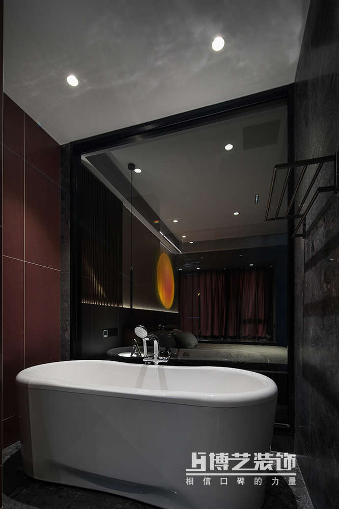 玻璃的隔斷,讓空間在視覺上得到拓展,紅與黑的低飽和綻放,讓高級感鋪面而來,在暗夜里撩撥著誰。