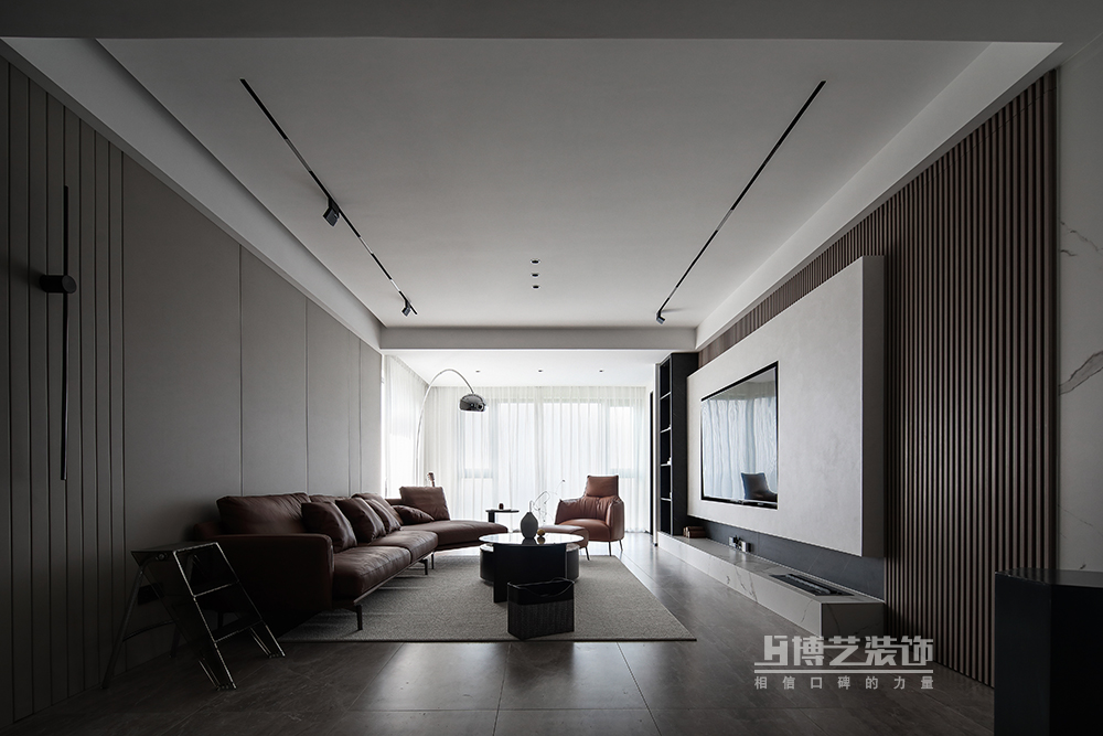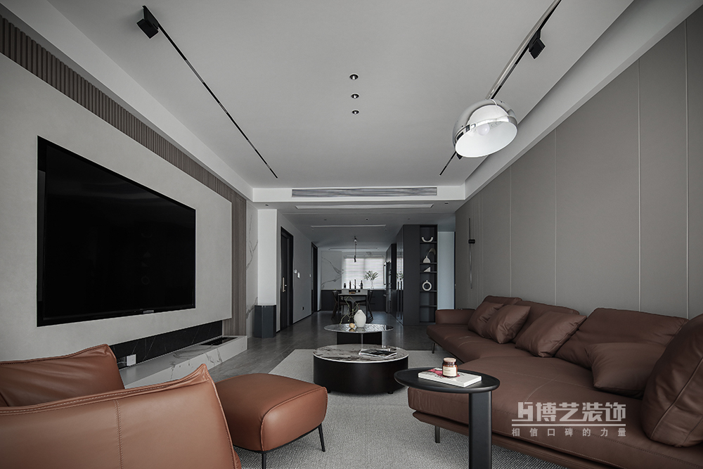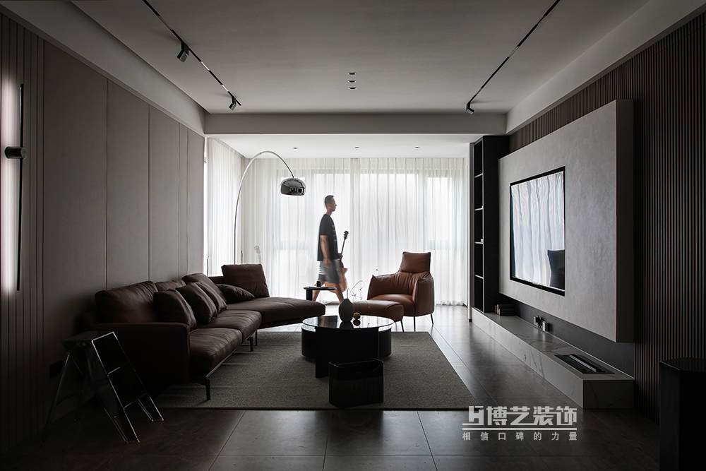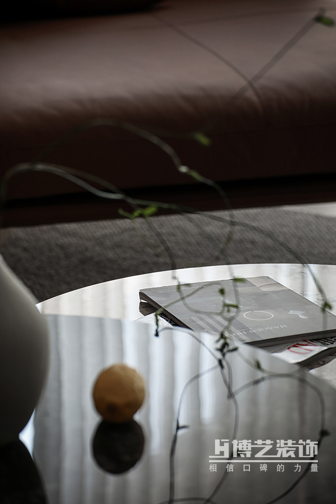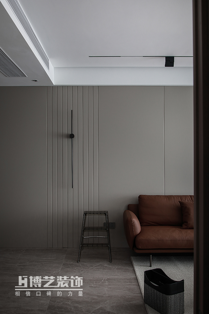 灰色的硬包墻面,線條疏密有致的排列,棕色的大轉(zhuǎn)角皮質(zhì)沙發(fā),散發(fā)著親近的味道,在家里可以溫柔得隨意,舒適得自然。