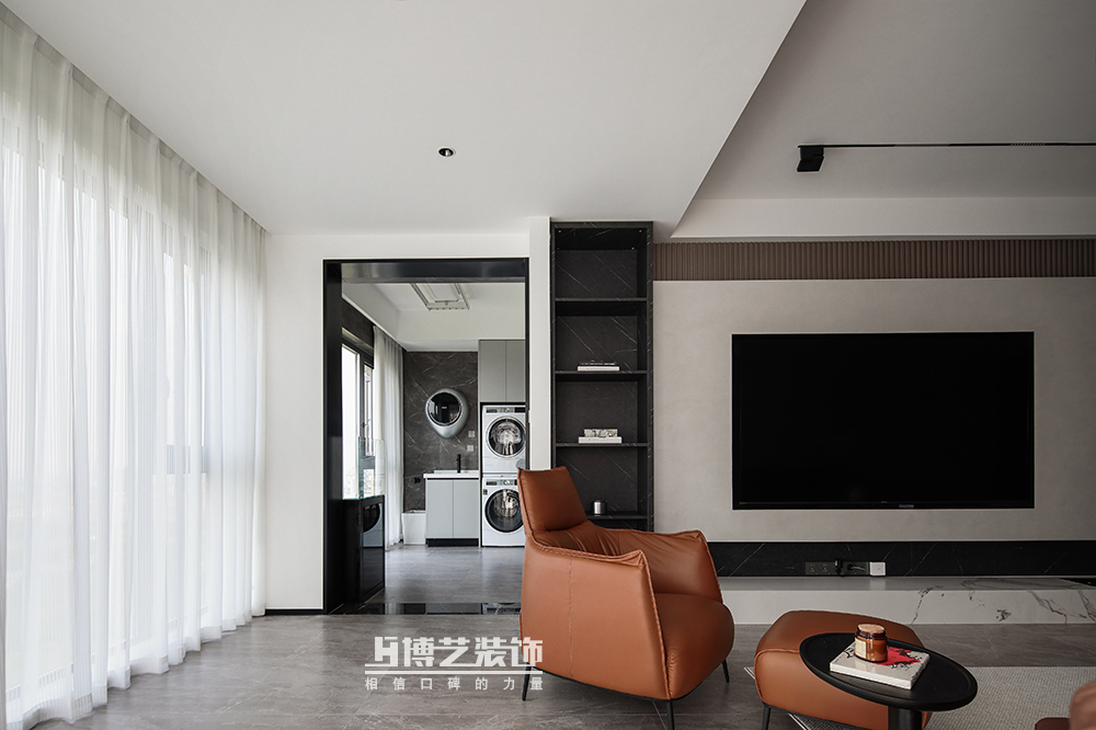黑白灰的空間,留白的處理讓空間在視覺(jué)上擴(kuò)散,通鋪的灰色瓷磚延伸出優(yōu)雅的氣質(zhì),疊加的立體感與色彩的層次感,讓客廳散發(fā)著一種雅致的高級(jí)感。