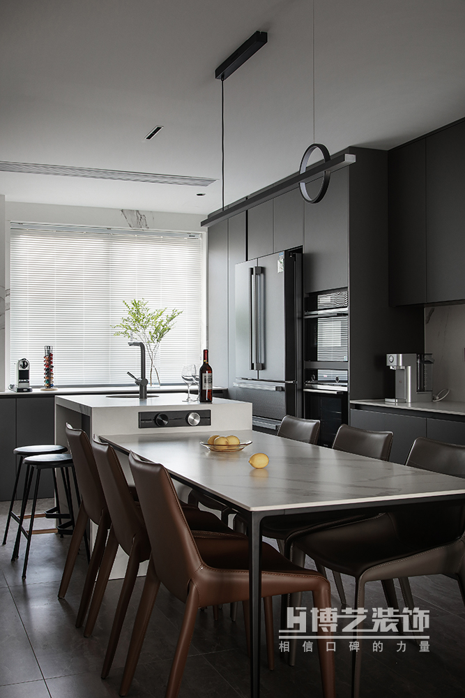 島臺(tái)與餐桌相連,讓空間不會(huì)過(guò)分空曠且狹長(zhǎng),兩把高腳凳是兩個(gè)人的慵懶隨意,餐桌融入的就是一家人的天倫之樂(lè)。