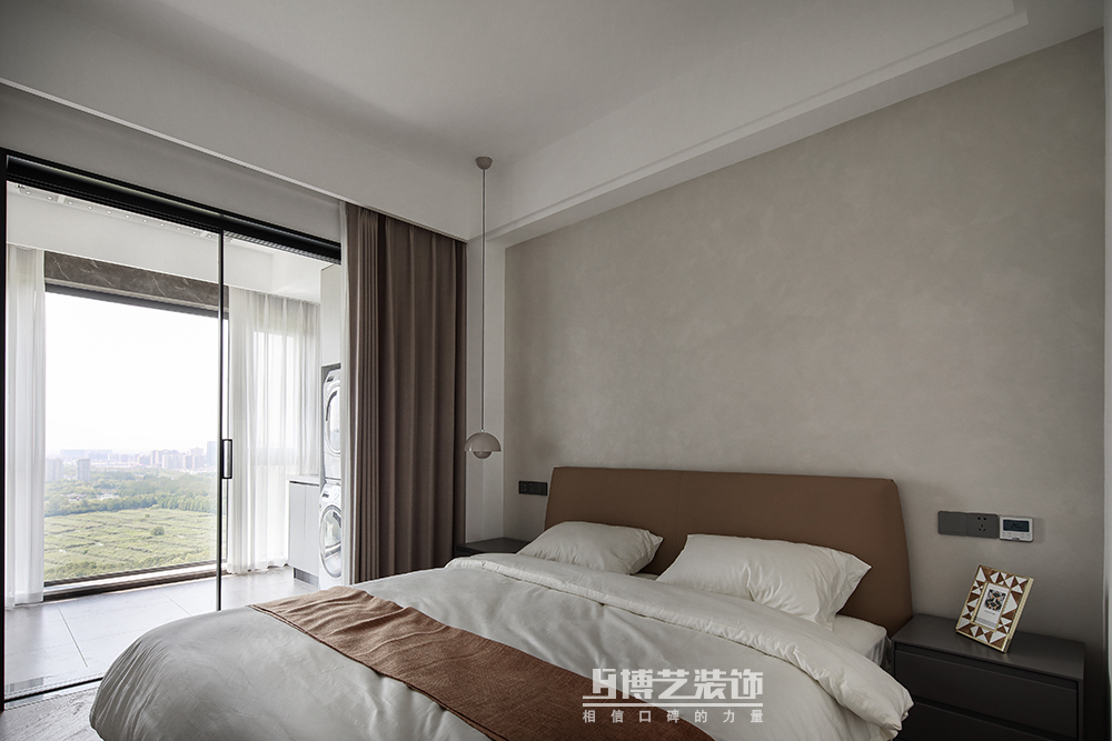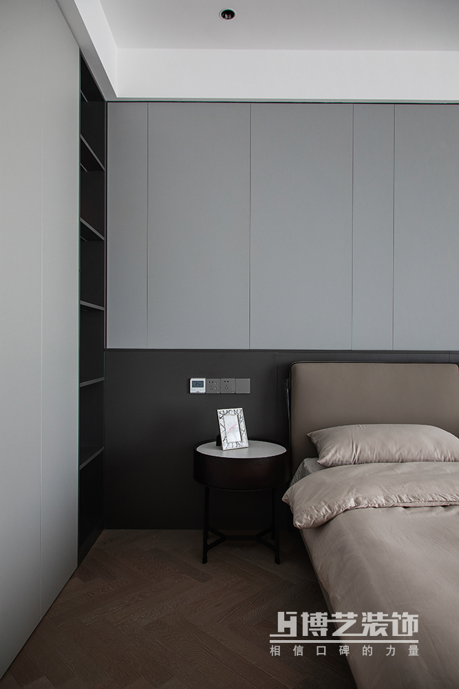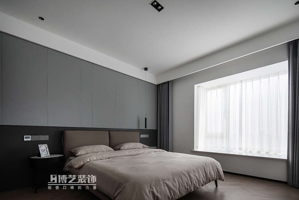 木飾面與硬包拼搭組合的床背景,融入線條的設(shè)計(jì),不顯單調(diào)。打開(kāi)床頭的燈落下溫柔的夜,灰調(diào)讓空間安靜,棕色填補(bǔ)溫暖,兩個(gè)人的愛(ài)是包容,理解和陪伴。