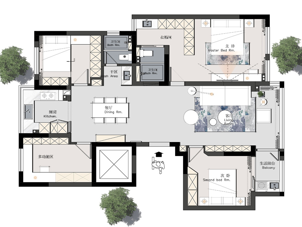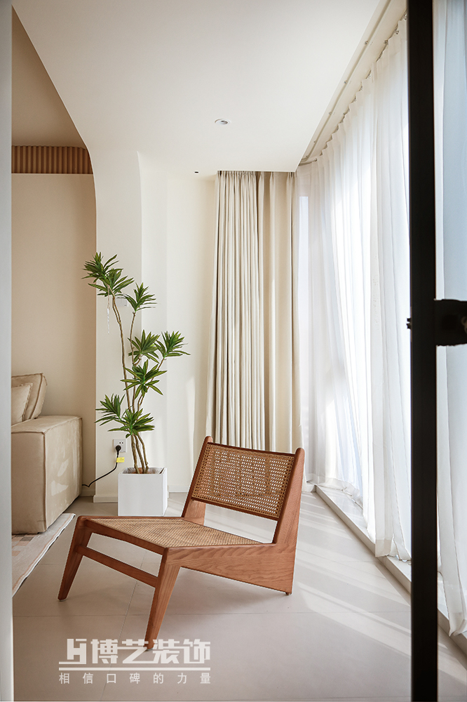 陽(yáng)臺(tái)與客廳貫通,讓光線全面滲透,綠植、藤椅,仿佛召喚著一場(chǎng)居家“野營(yíng)”的到來(lái)。
