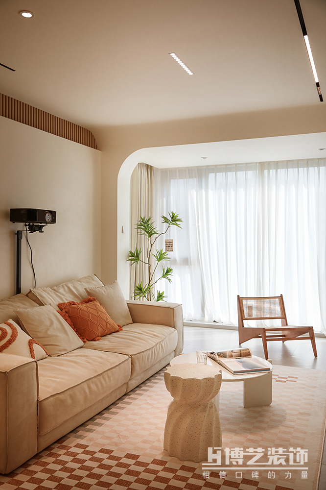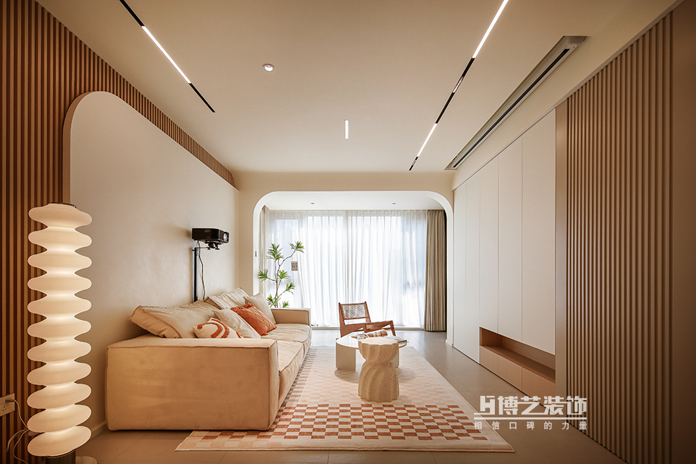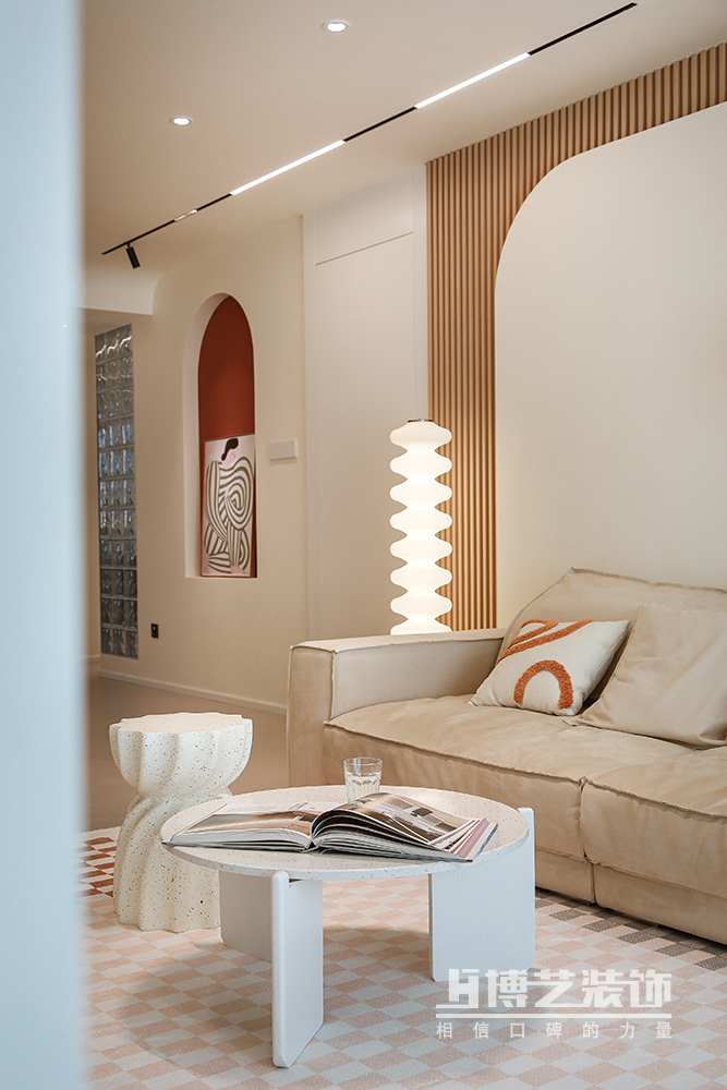 客廳是奶油白與自然木作的結(jié)合,運(yùn)用一些圓弧質(zhì)感,讓極簡(jiǎn)的空間不再單調(diào)。