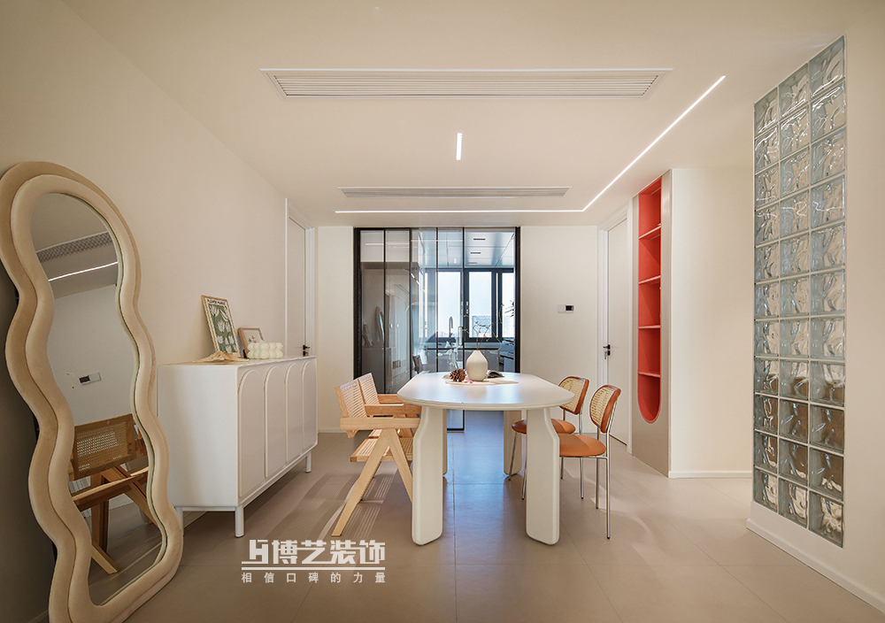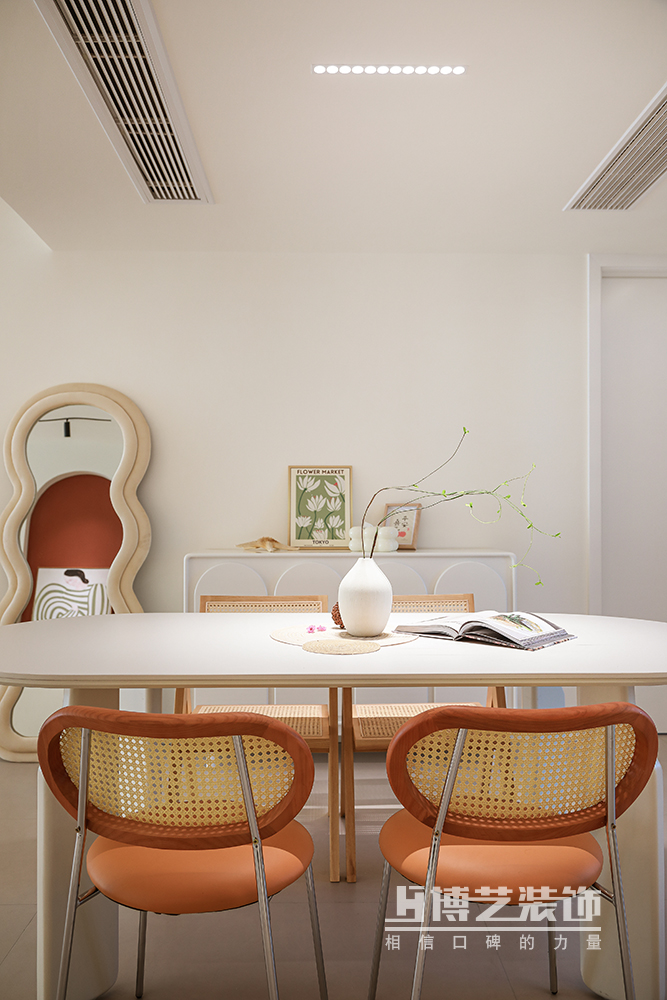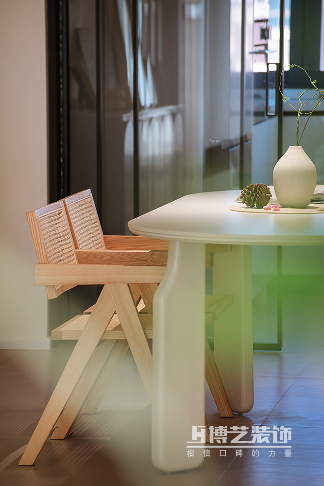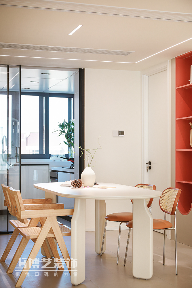 白色餐桌與藤編的木質(zhì)椅讓簡(jiǎn)約不簡(jiǎn)單,旁邊紅色的置物柜是春日里突然閃現(xiàn)的花朵,翩然入境。