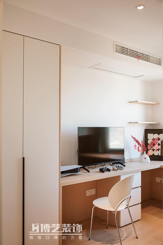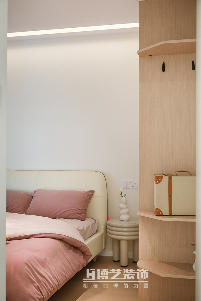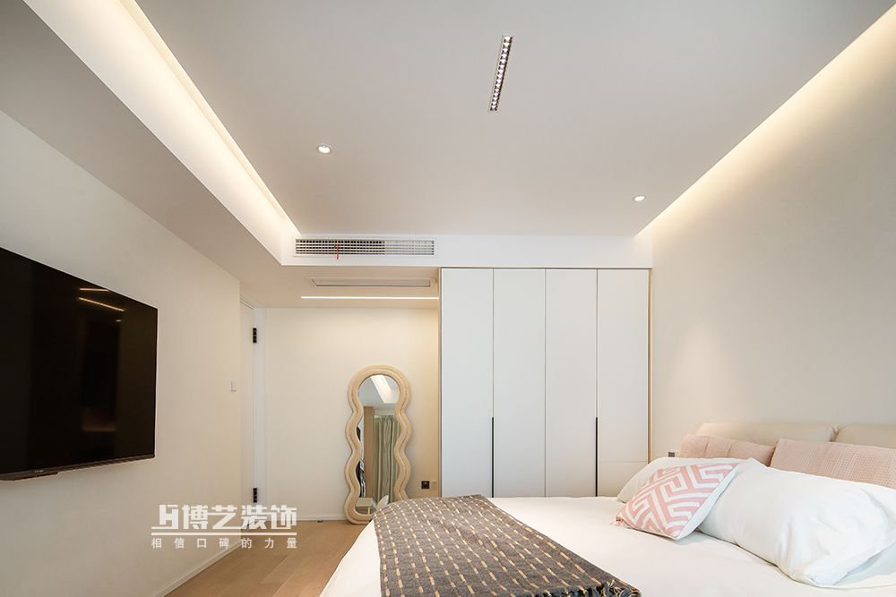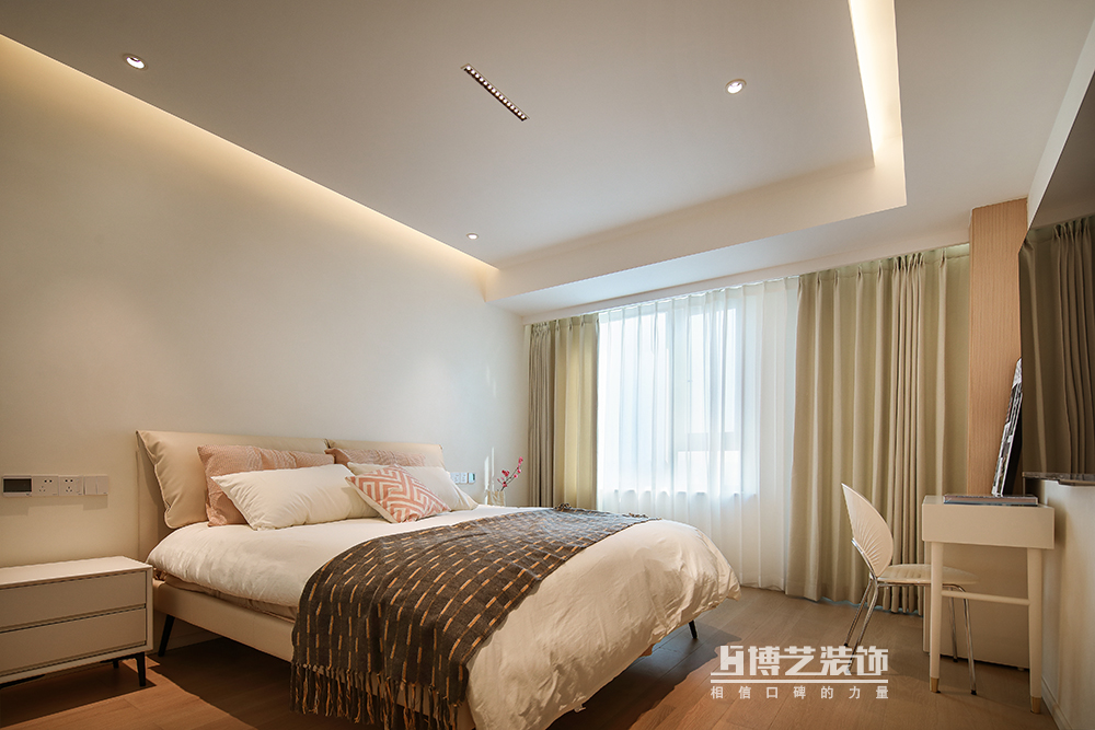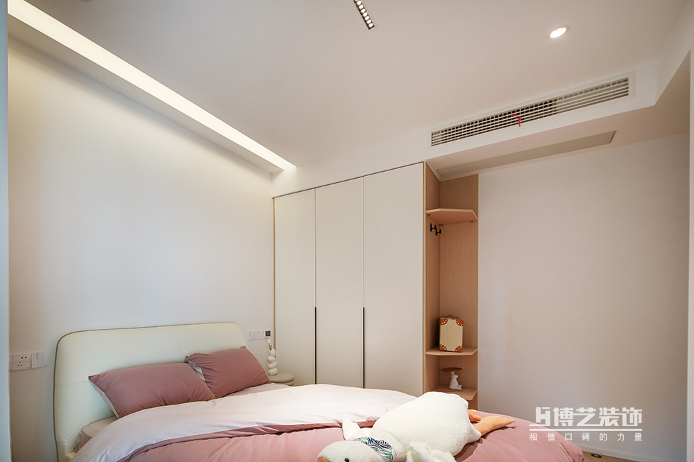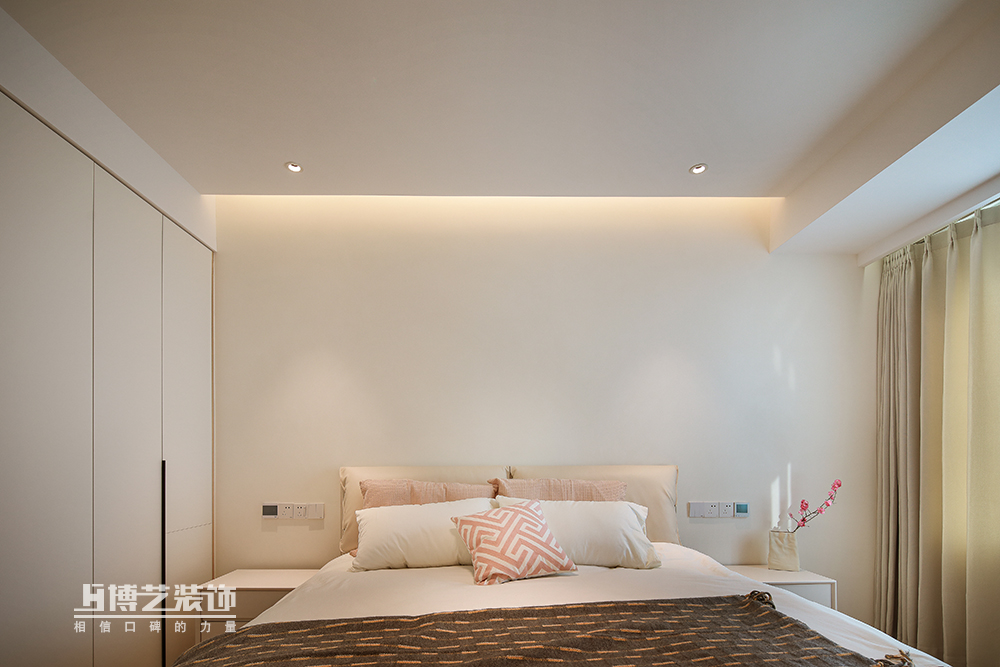 次臥延續(xù)極簡(jiǎn)的基調(diào),干凈利落,床頭貫通的燈光打破空間的單一,把靈魂注入空間。