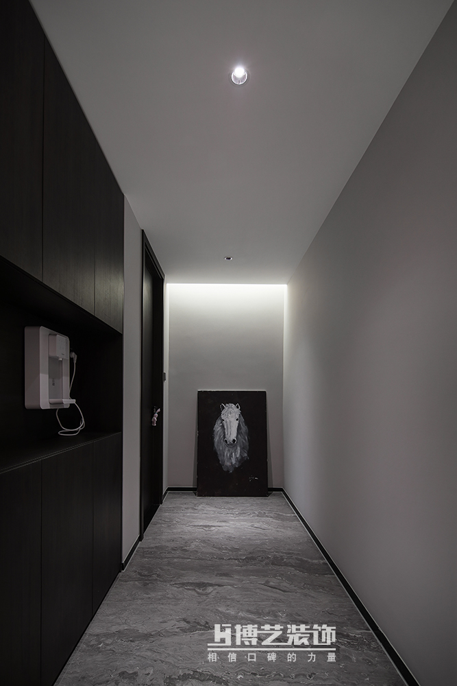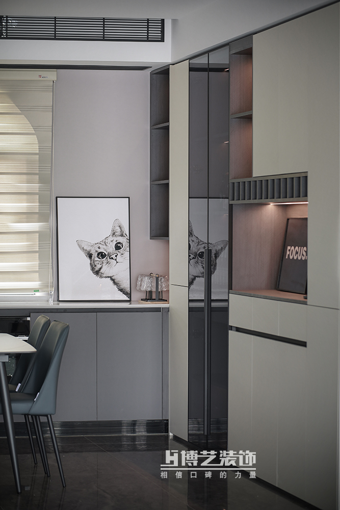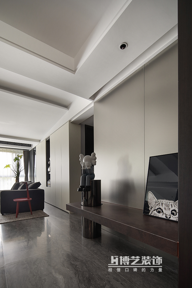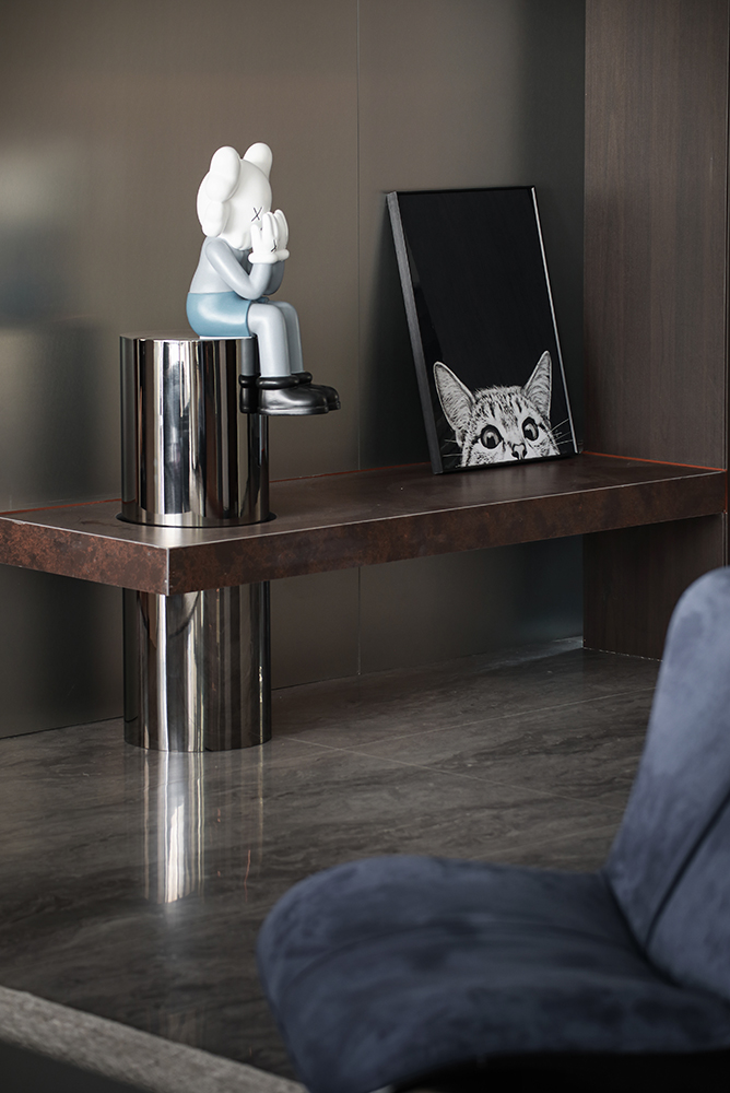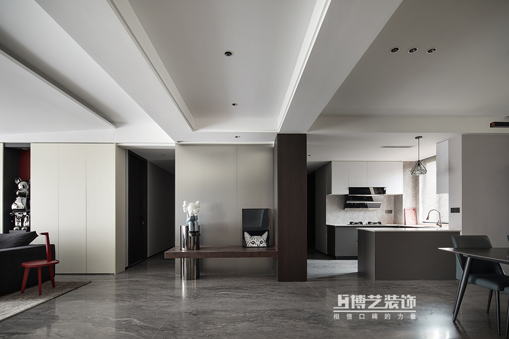得益于一梯一戶的優(yōu)勢,把鞋柜安置于門廳,讓客餐廳部分更完整。玄關(guān)順勢利用柱子做入戶造景,打破傳統(tǒng),給予開門的儀式感。Kaws網(wǎng)紅公仔與亮面不銹鋼的結(jié)合,精致又不失個(gè)性,別具一格的潮流風(fēng)。