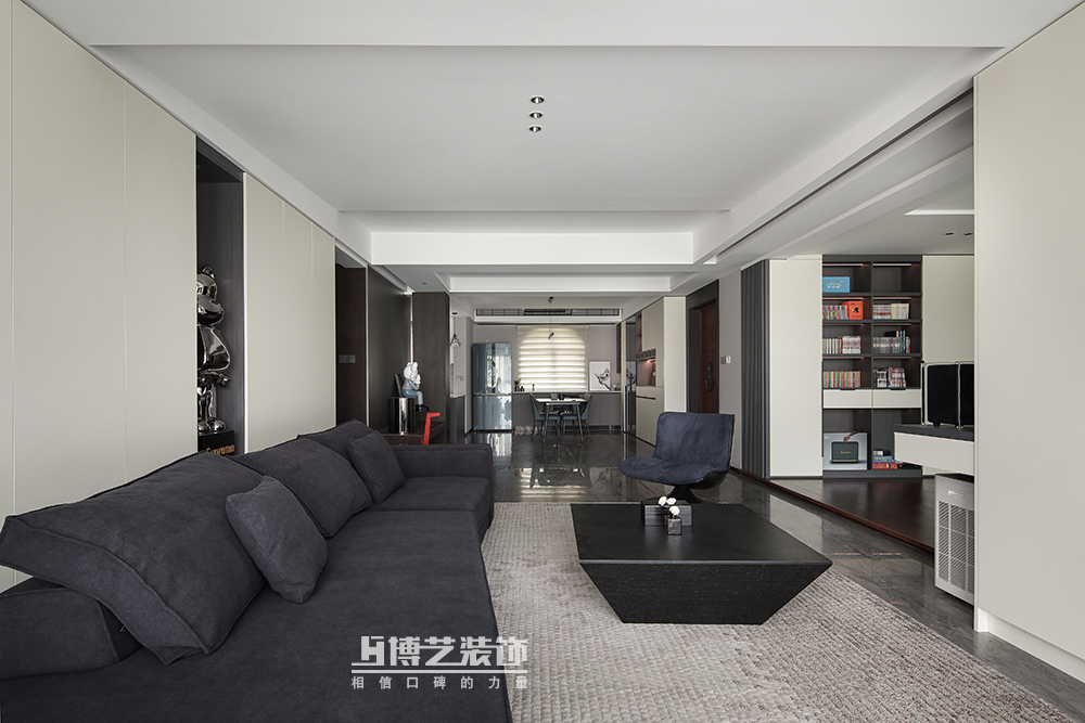 客廳采用的是一個(gè)“去客廳”的設(shè)計(jì),去掉“雞肋”的電視背景墻,使整體空間更加的寬闊透明,符合當(dāng)下年輕人喜歡聚會(huì)、交友的興趣愛好。