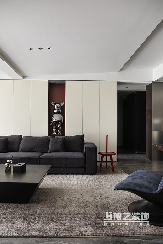 整體黑白灰的色調(diào)通過極簡的手法融合,再加上一點(diǎn)點(diǎn)復(fù)古的紅色,創(chuàng)造一個(gè)高級(jí)、舒適的居家環(huán)境。兩側(cè)的柜體兼具收納及生活功能,滿足生活上的需求。