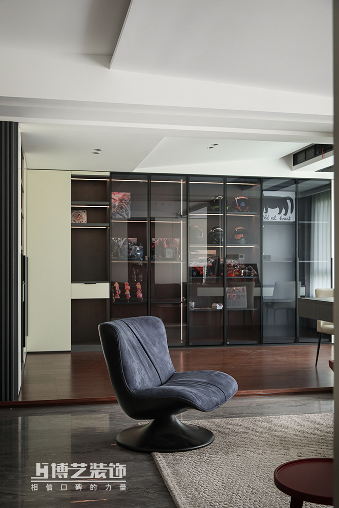 敞開式的書房可以與客廳合為一體,人多也不怕?lián)頂D;未來ta也可以作為親子游戲的場地。地臺(tái)的設(shè)計(jì)與客廳形成一點(diǎn)落差把客廳與書房做出功能上的區(qū)分。L型的書柜是書本與業(yè)主“藏品”的歸屬地。