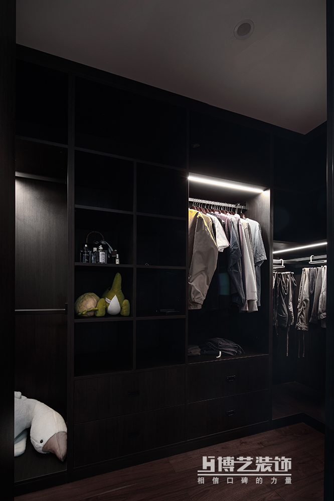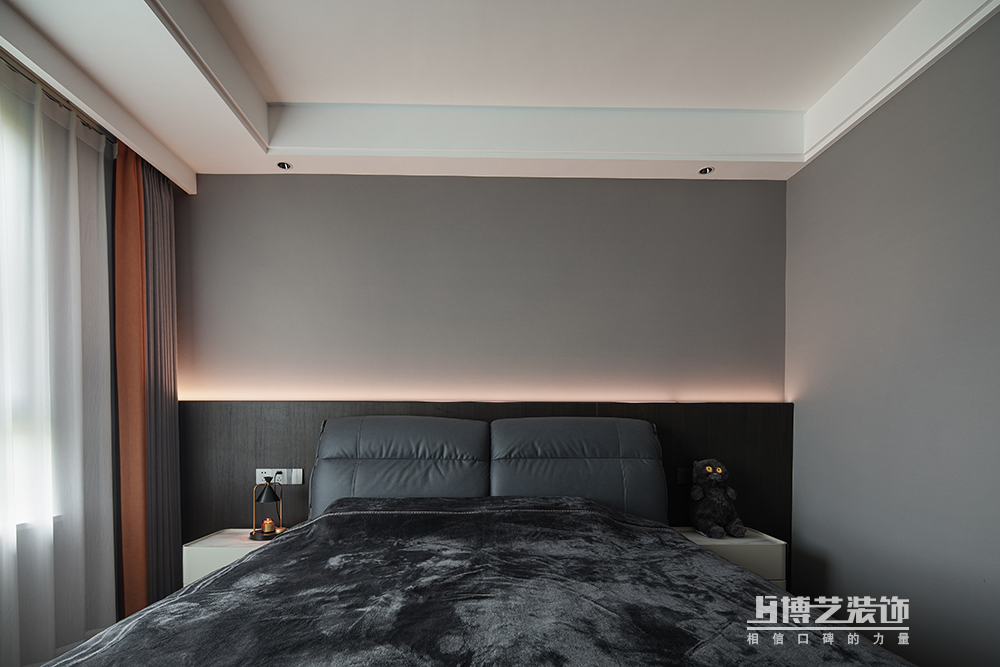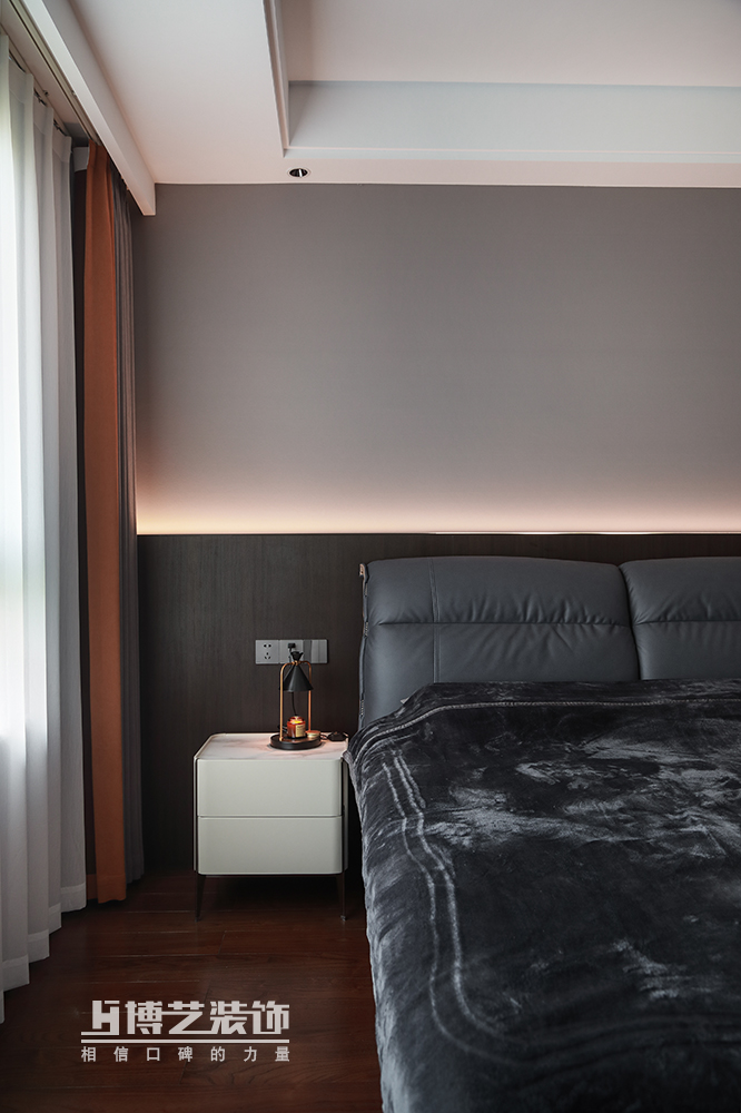 主臥依舊延續(xù)了極簡的基調(diào),暖灰色的空間點(diǎn)綴深藍(lán)色的床靠,低飽和的色調(diào)有種莫名的治愈力,暗藏的燈光帶來高級(jí)的氛圍感,讓煩躁的心瞬間歸于平靜,安心睡個(gè)好覺。
