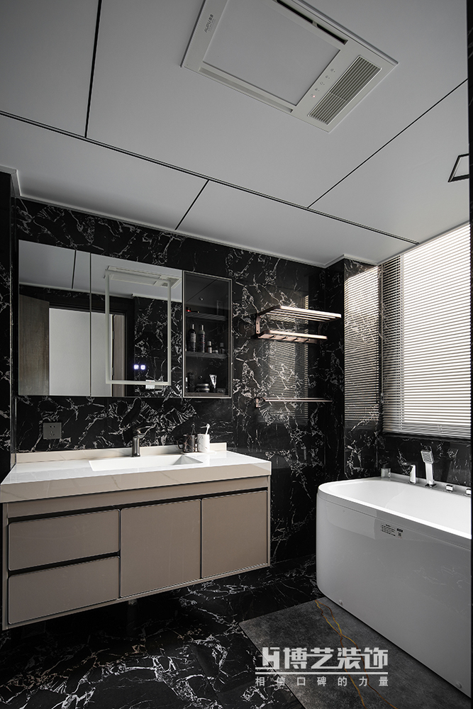 暗黑系的衛(wèi)生間深邃、高級(jí),白色張揚(yáng)黑色收斂,極致的反差給空間帶來別致的感官,增加個(gè)性的體驗(yàn)。