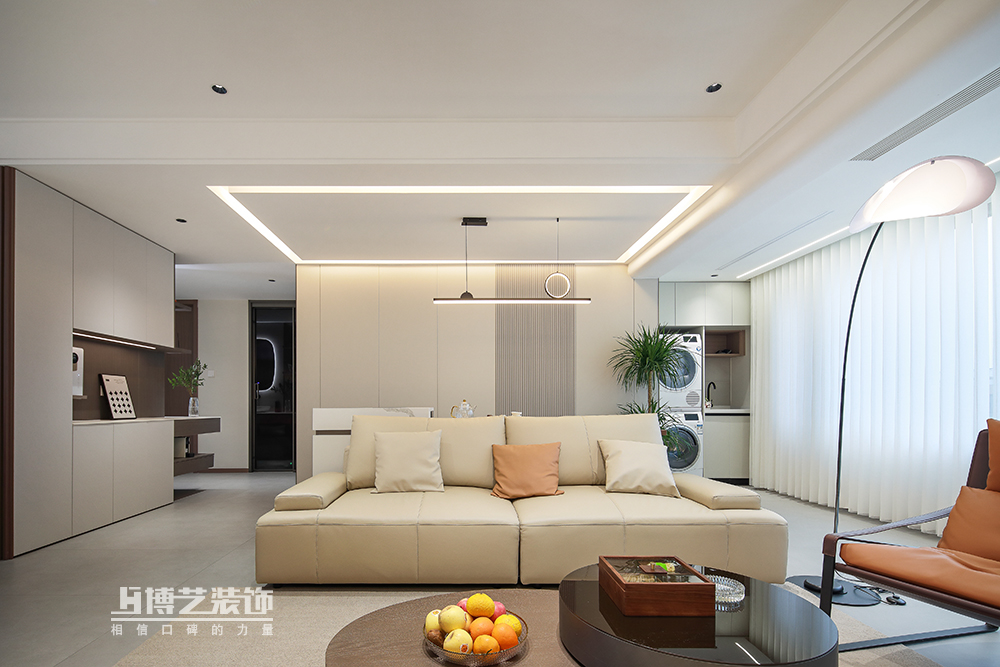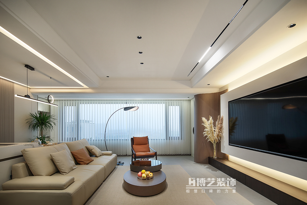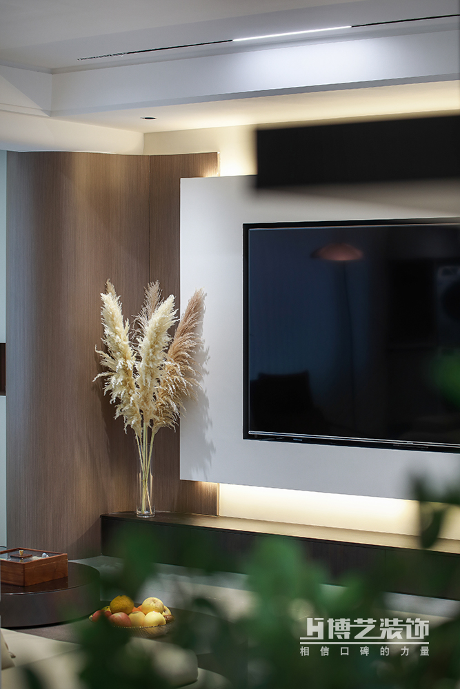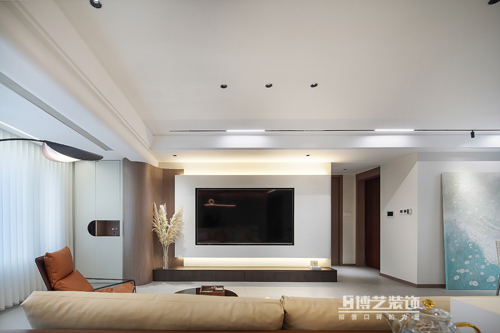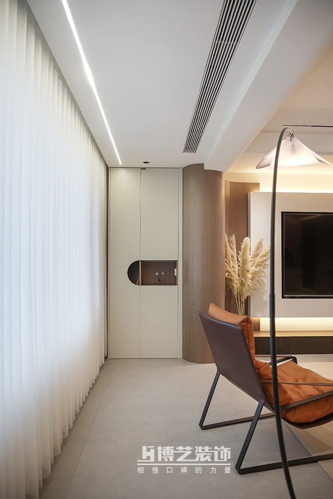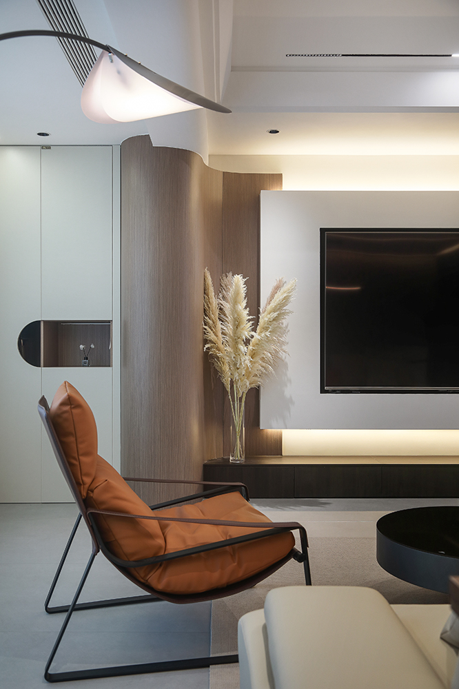 客廳與陽臺打通,擴大空間,做弧形墻過渡,交互設(shè)計懸空電視墻,豐富空間形式,將設(shè)計感拉滿。