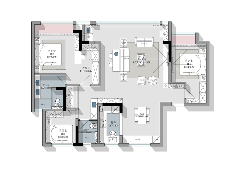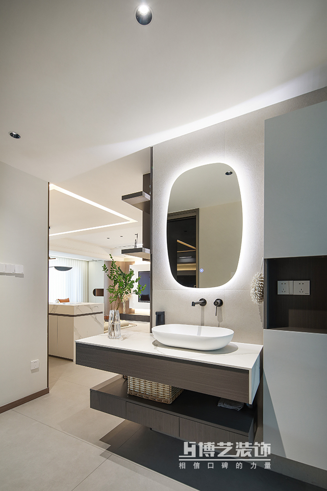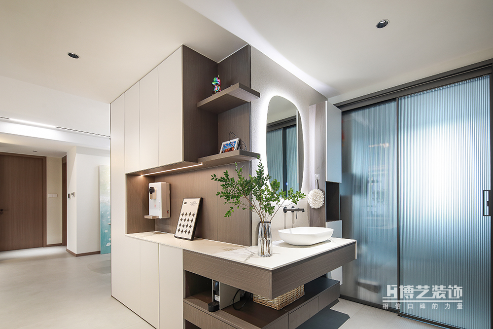 干濕分離的設(shè)計,干區(qū)做“L”型設(shè)計與過道相容,增加空間的互通與美感,同時兼具實用性。