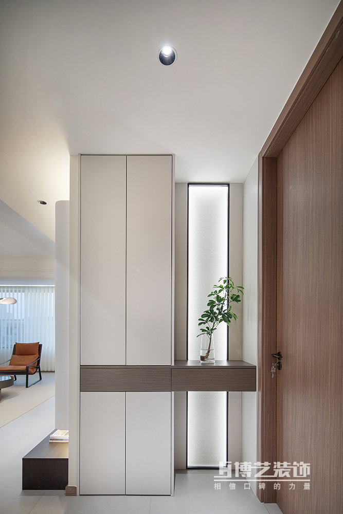 入戶做通頂鞋柜,滿足生活需求,利用穿插設(shè)計做延伸,搭配玻璃隔斷透光、美觀又實用。