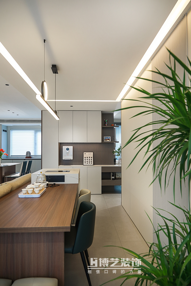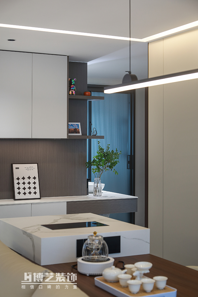 茶室與客廳相連,增加空間的通透性,同時也有利于增加家人間的互動與親密,導(dǎo)臺的設(shè)計讓品茶更為科學(xué)方便。