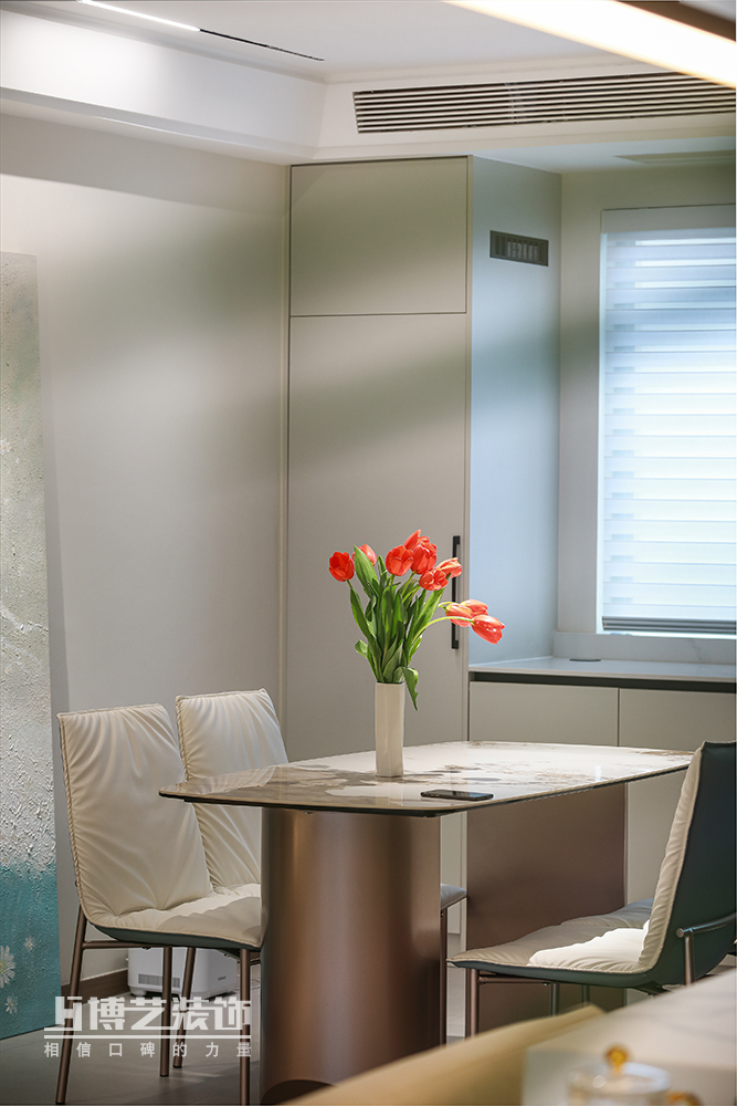 餐廳靠墻做柜子方便生活收納,裝飾畫明麗清新,為就餐平添幾分好心情。