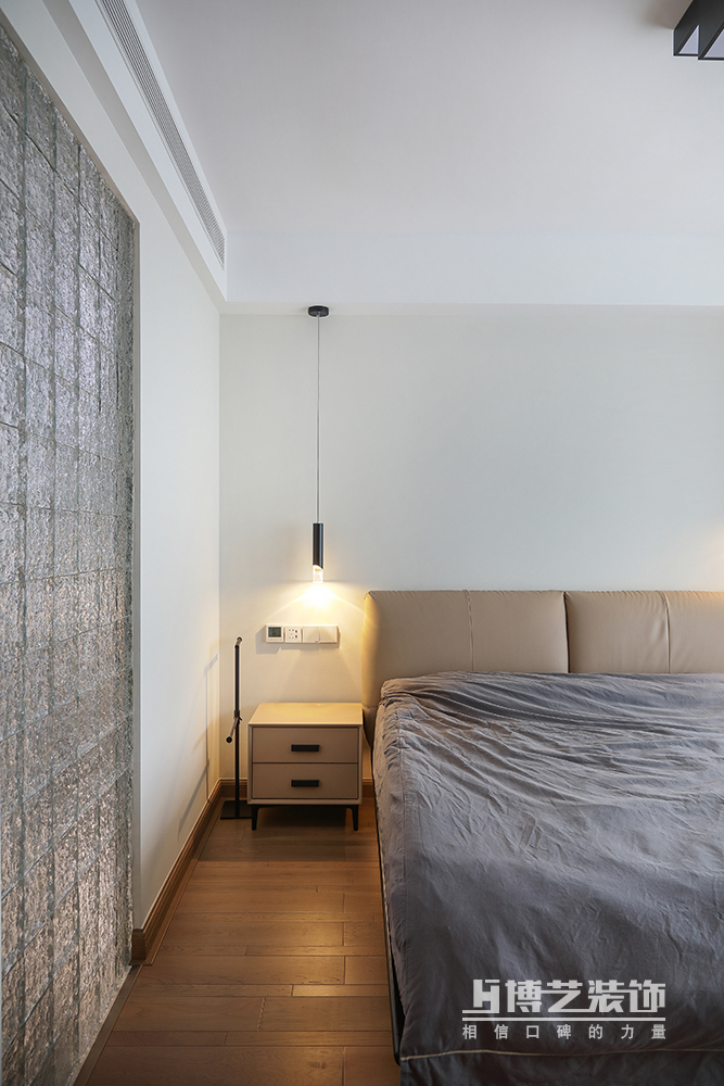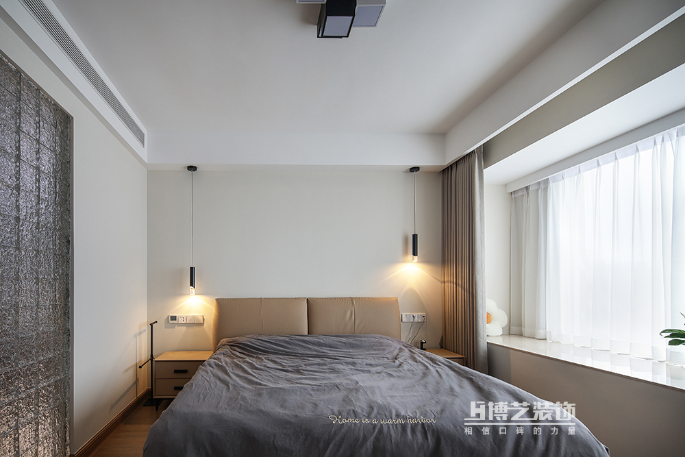 白色與奶咖色極簡的運用,營造舒適靜謐的睡眠環(huán)境,高低錯落的床頭燈讓空間變得有層次,暖色調(diào)的光帶來溫柔主義的氛圍。